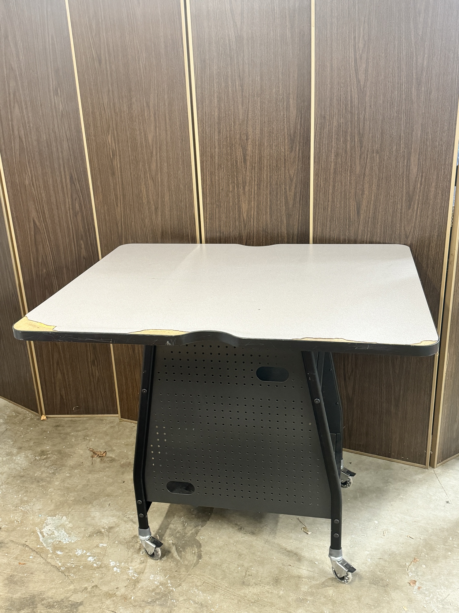 Mobile presentation table or workstation. Features a gray tabletop, black metal frame with perforated panels, and two shelves for storage. Rolls on casters. 38 x 46 x 35 in.