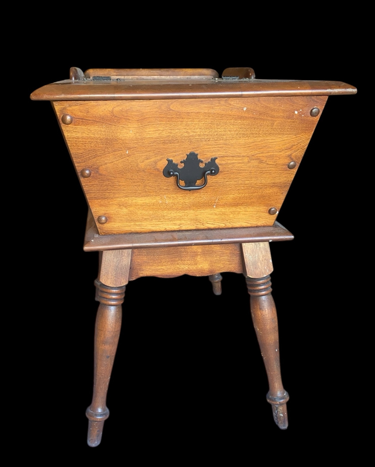 Dough box table (lift-top table). The top of the box lifts to reveal storage space, which can be used for magazines or other items.
