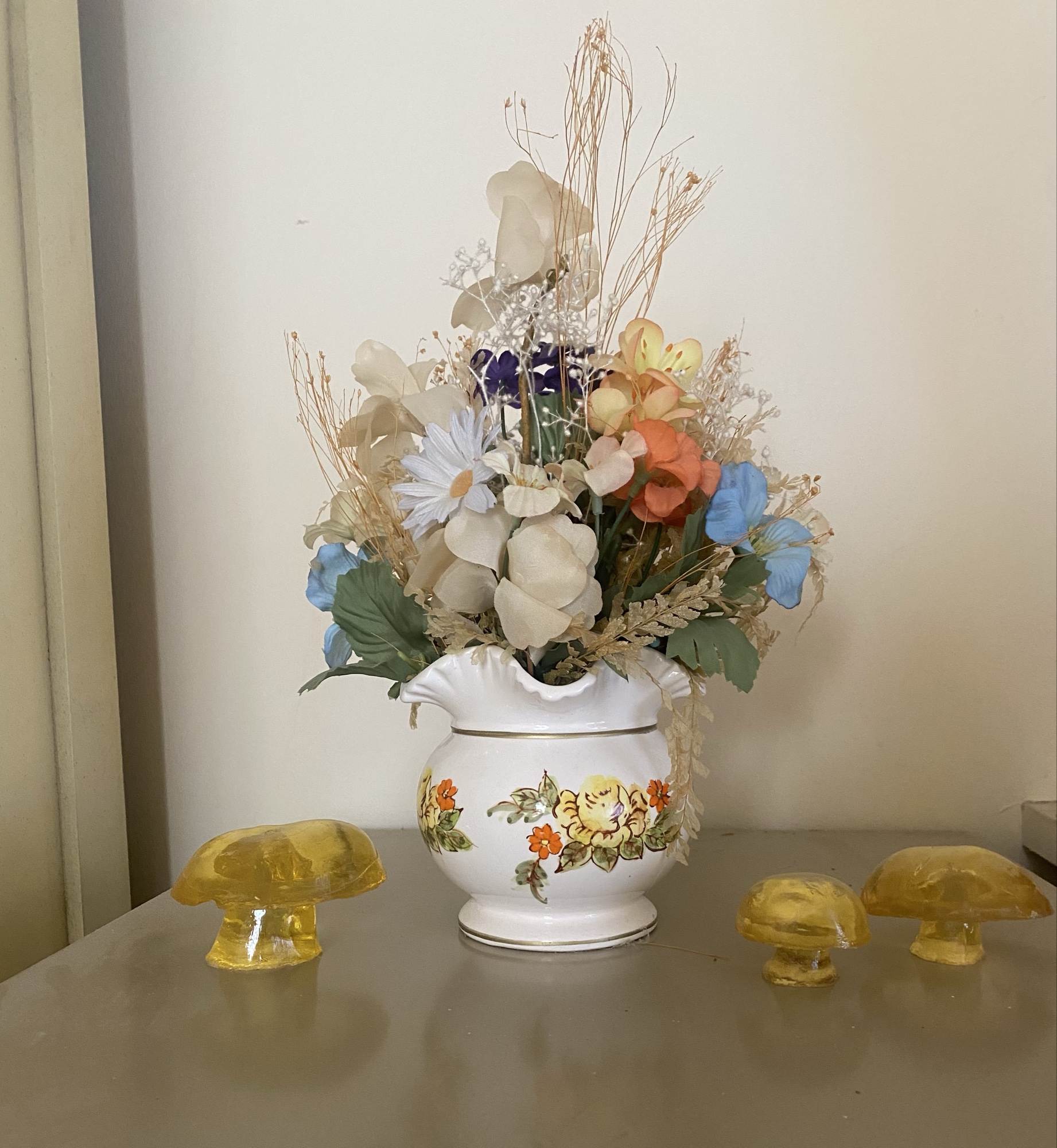 Floral arrangement in a decorative vase with 3 plastic mushrooms decor pieces