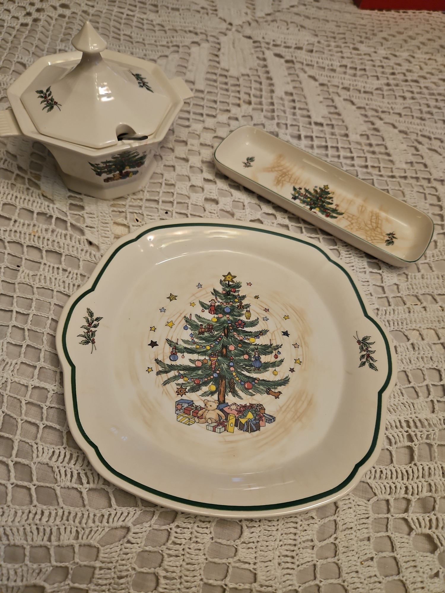 - The collection is crafted from durable fine ironstone (or bone china, depending on the specific piece) and features a decorated Christmas tree motif with gifts underneath.
