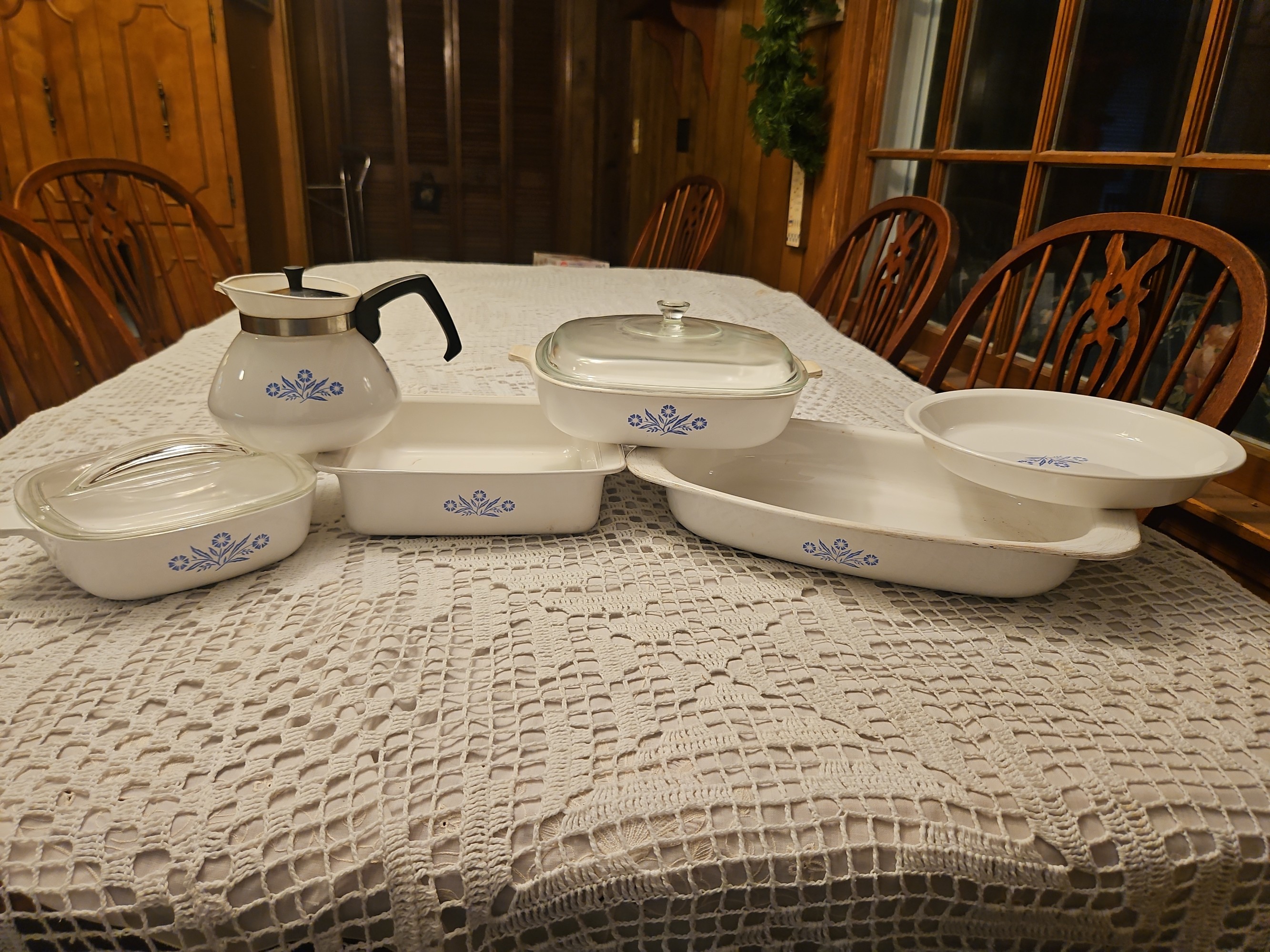 - The collection includes various items such as casserole dishes with glass lids, a percolator, and a roaster.