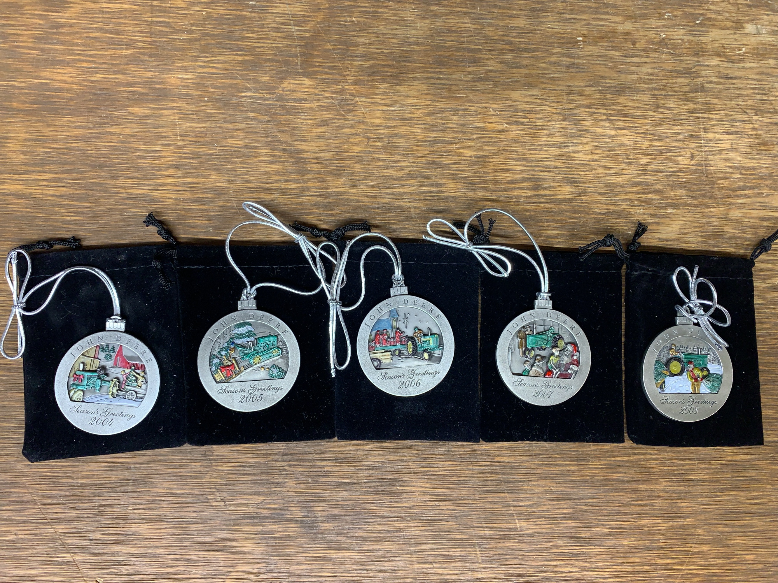 5 John Deere pewter Christmas ornaments with bags. 2004, 2005, 2006, 2007, 2008. Good condition.