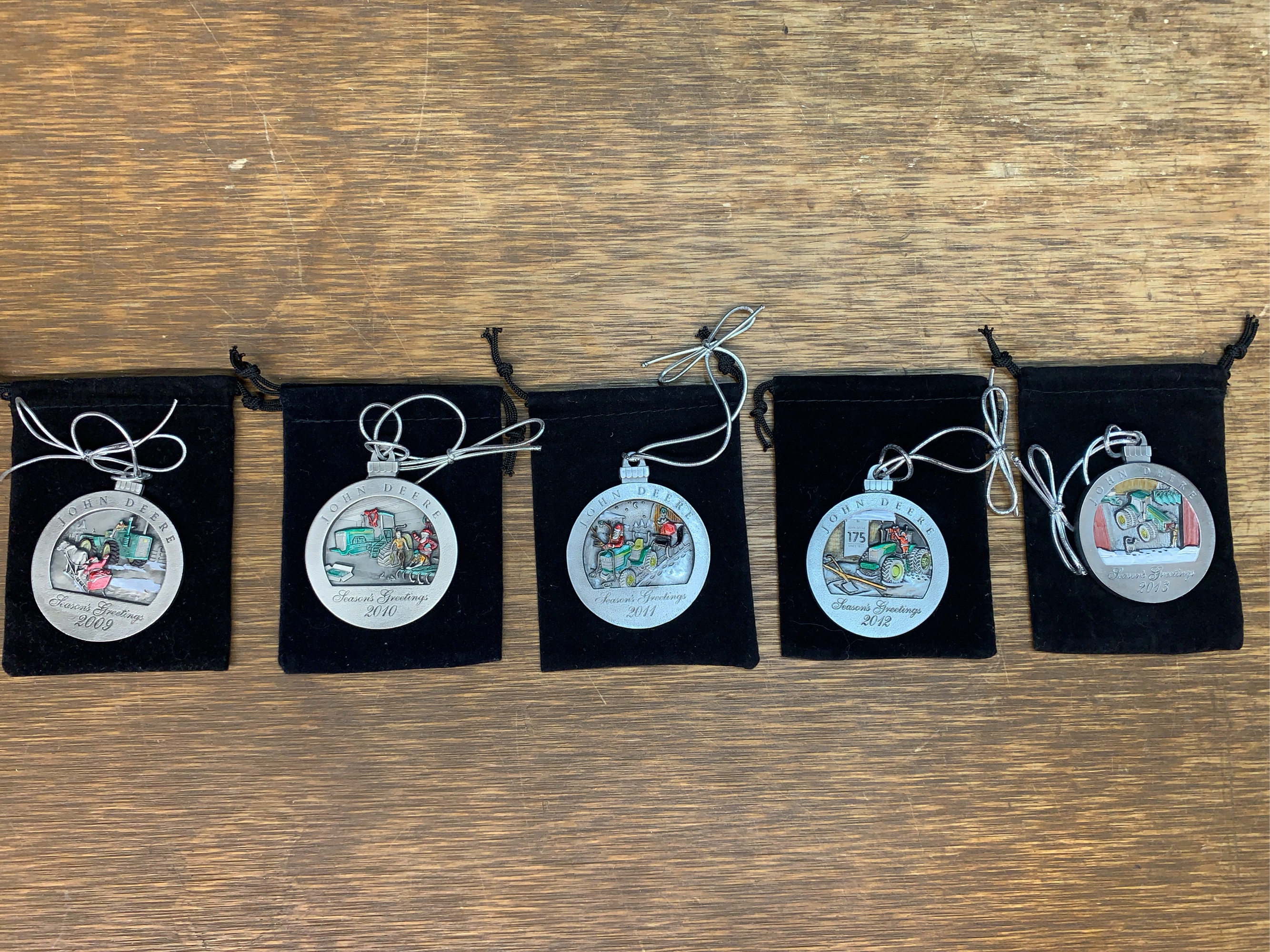 5 John Deere pewter Christmas ornaments with bags. 2009, 2010, 2011, 2012, 2013. Good condition.