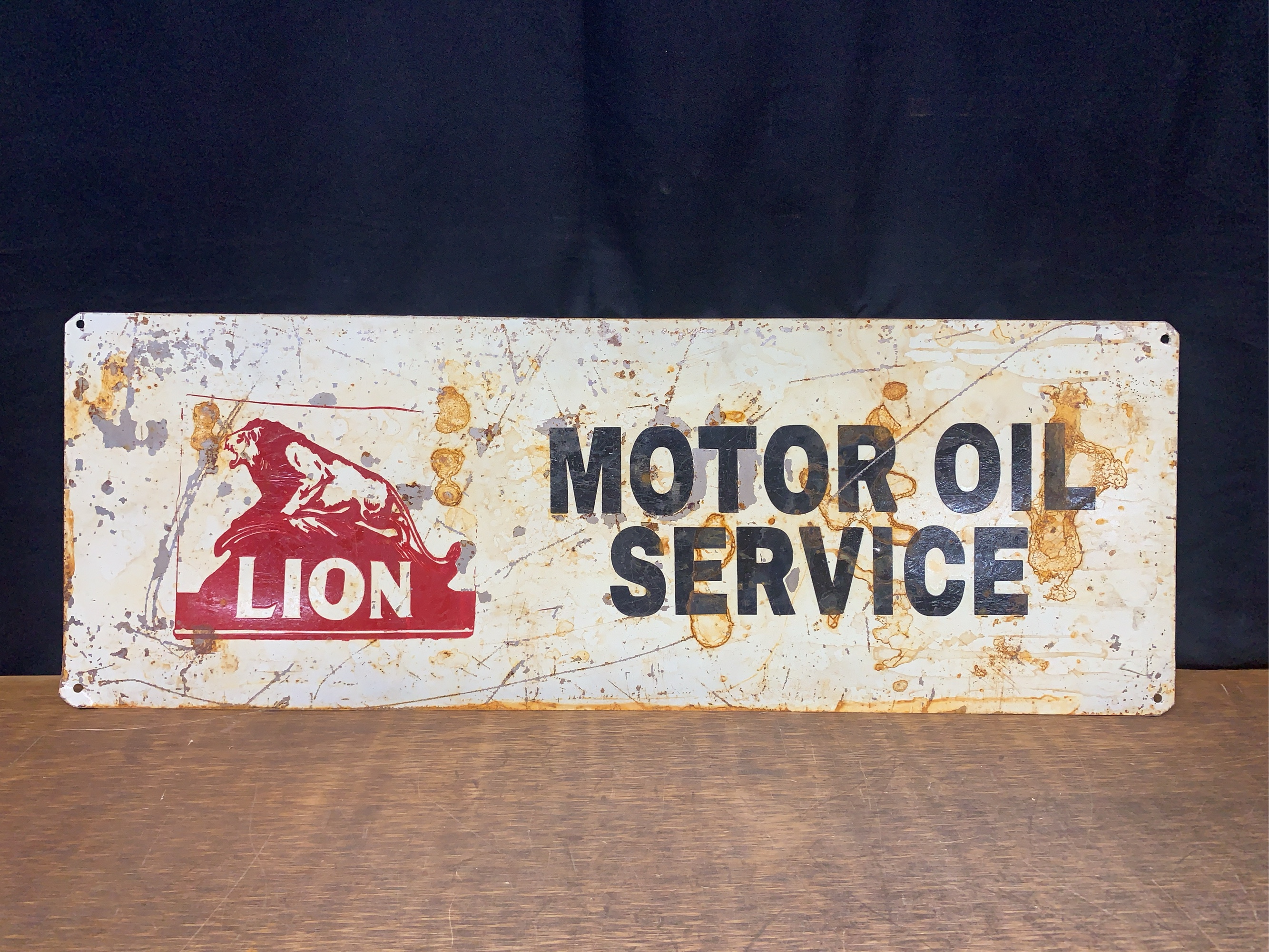 Lion Motor Oil Service SST sign. 32" x 11". Shows wear, scratches, and rust.