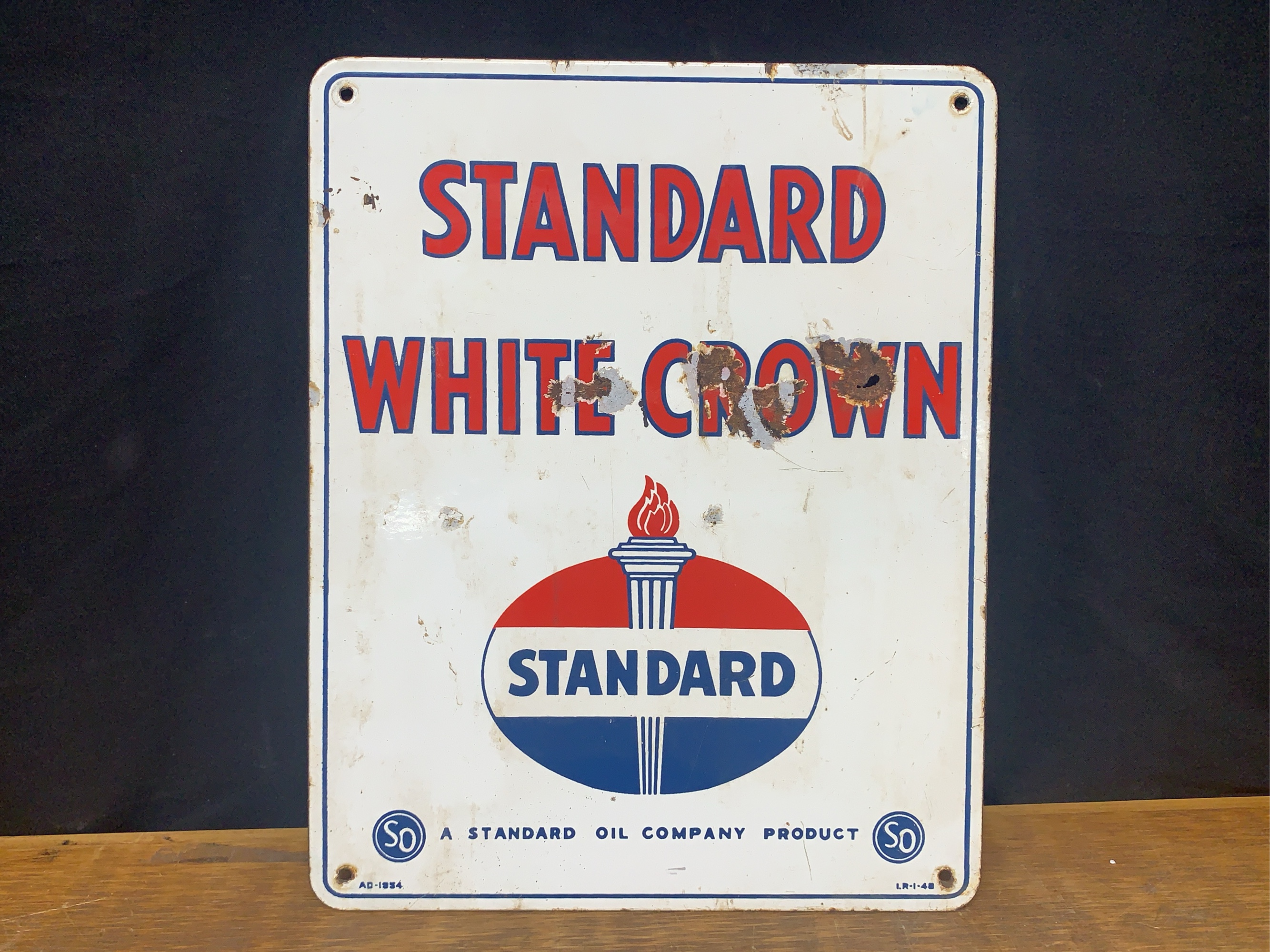 Standard White Crown SSP sign. 12" x 15". Shows wear, some loss of porcelain, rust, and hole.