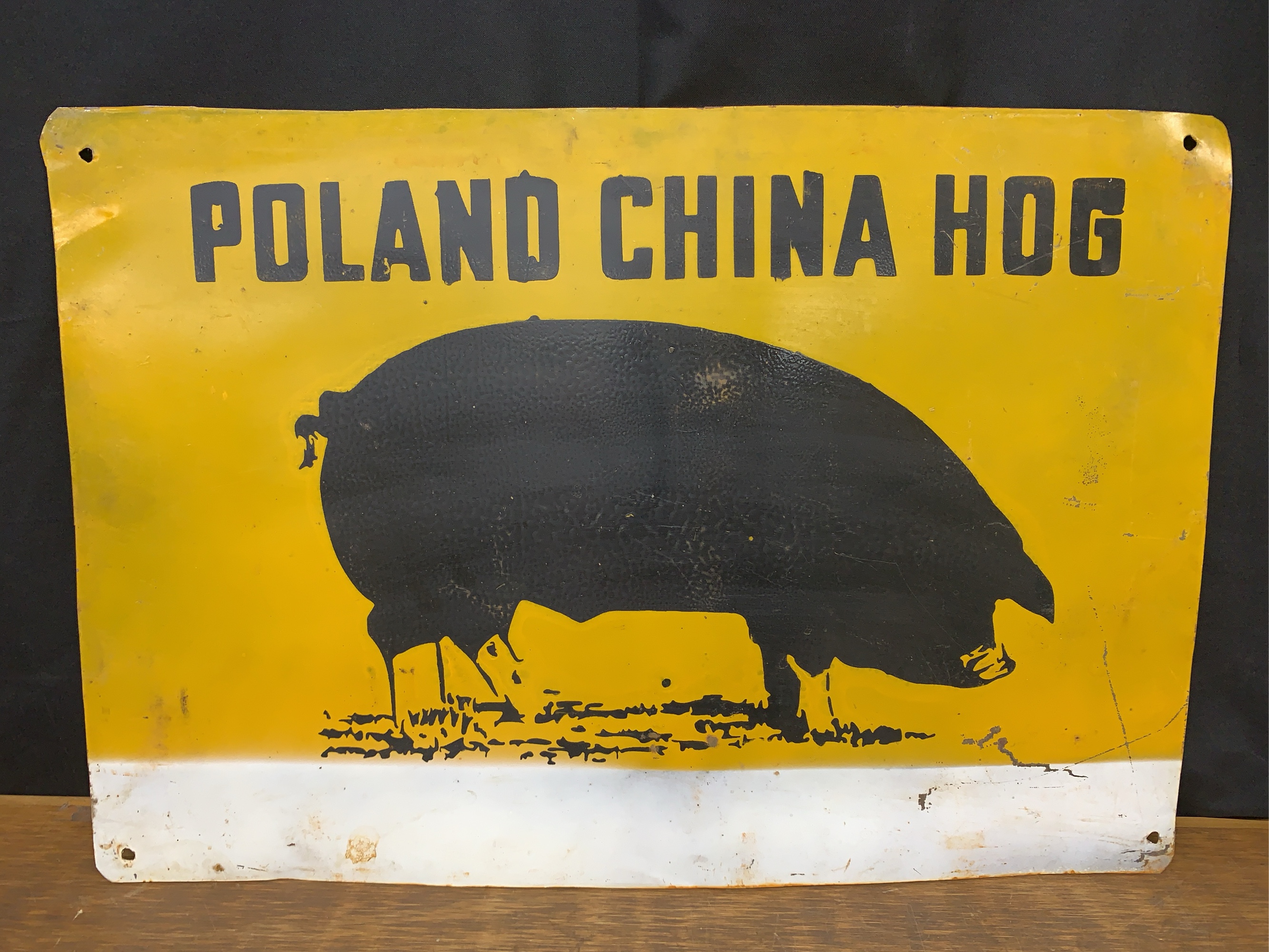 Poland China Hog SST sign. 15" x 22". Shows wear, bends, and rust on back.