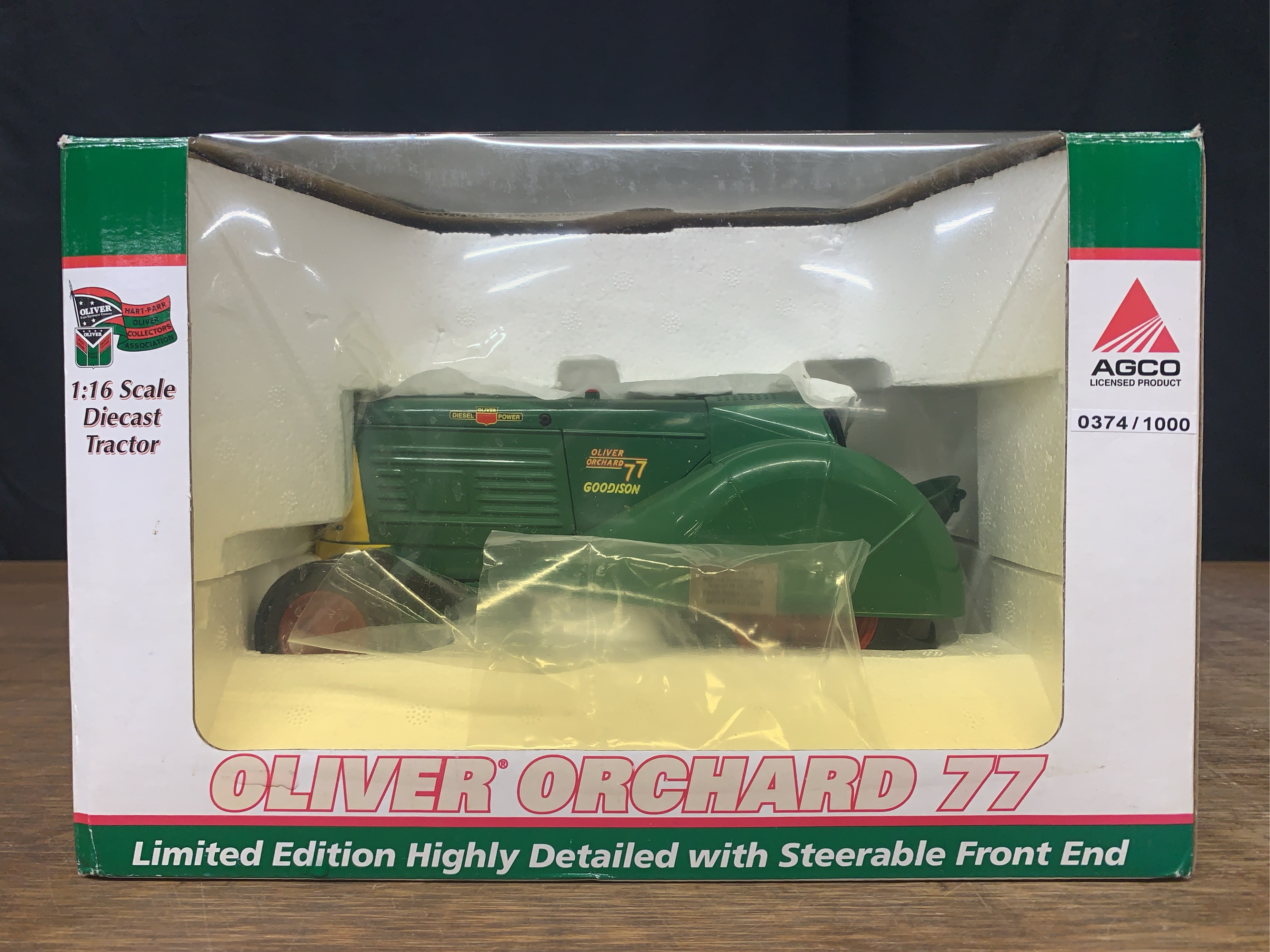 1/16 scale Oliver Goodison 77 orchard tractor 2007 HPOCA NIB made b SC. Box shows light wear and fading. Stock # Cust-911.