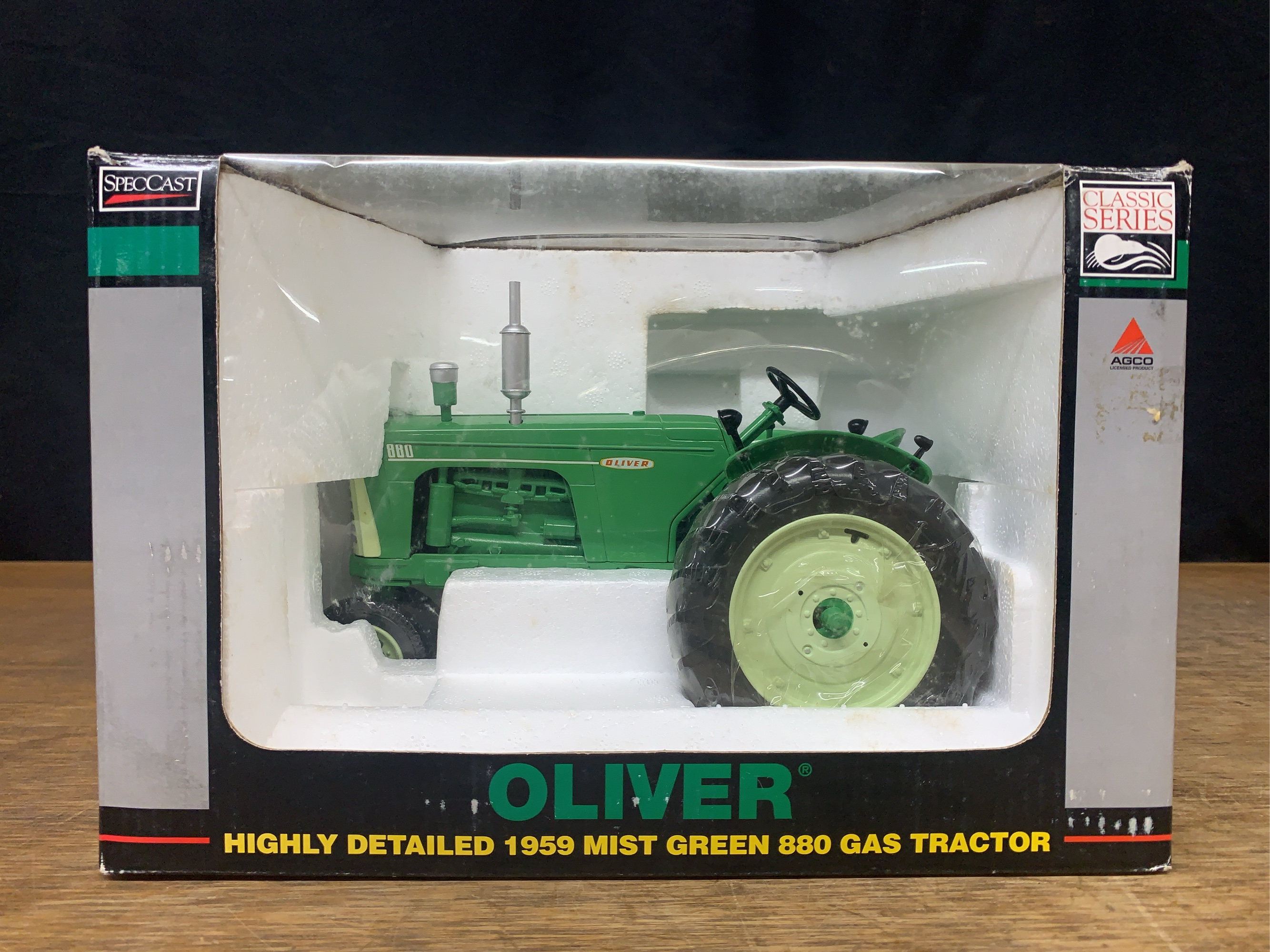 1/16 scale Oliver 880 Mist Green tractor NIB made by Spec-Cast. Box shows wear and light fading. Stock # SCT-310.