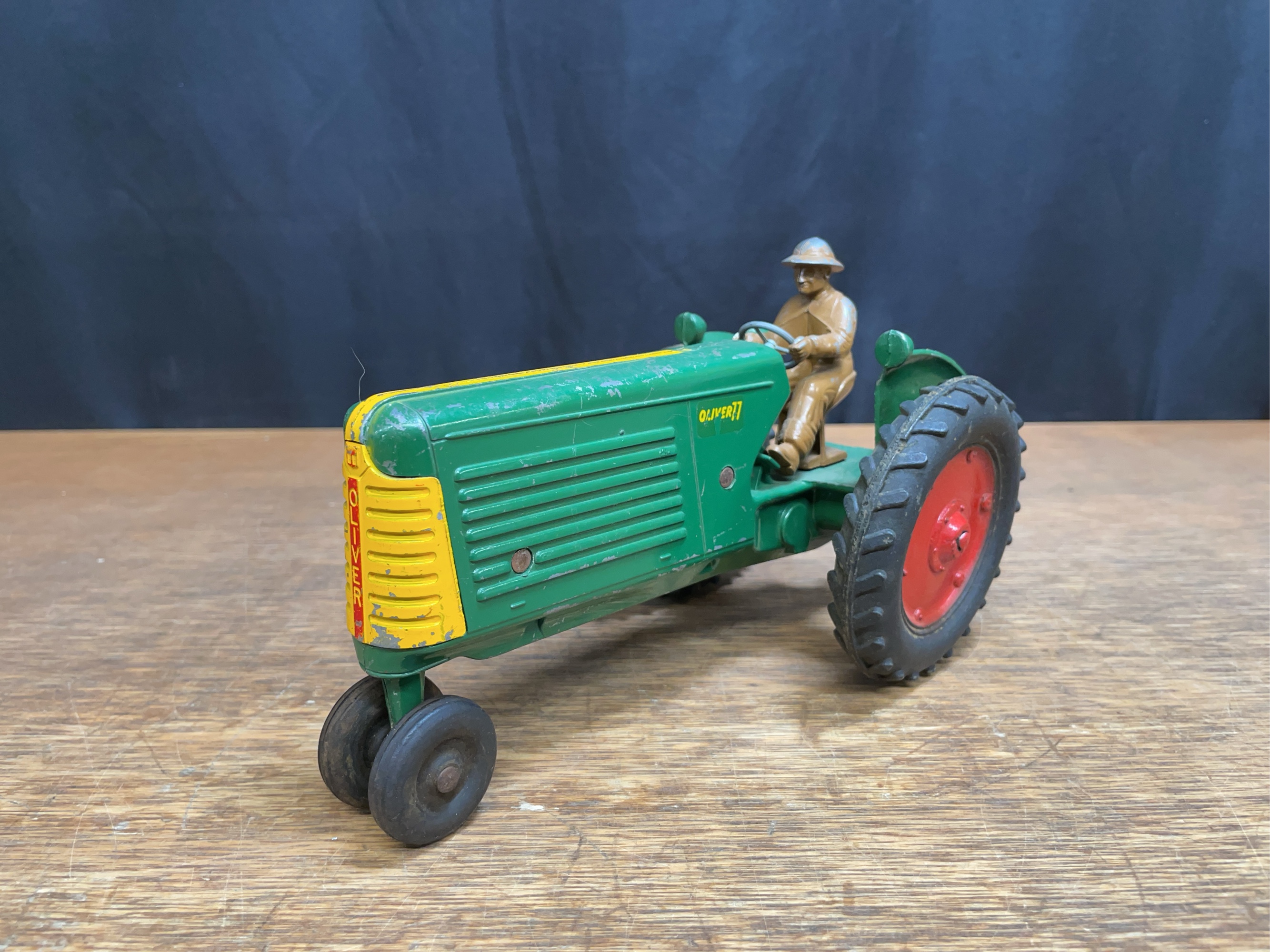 1/16 scale Oliver 77 tractor with driver made by Slik. Tractor shows wear and paint loss.