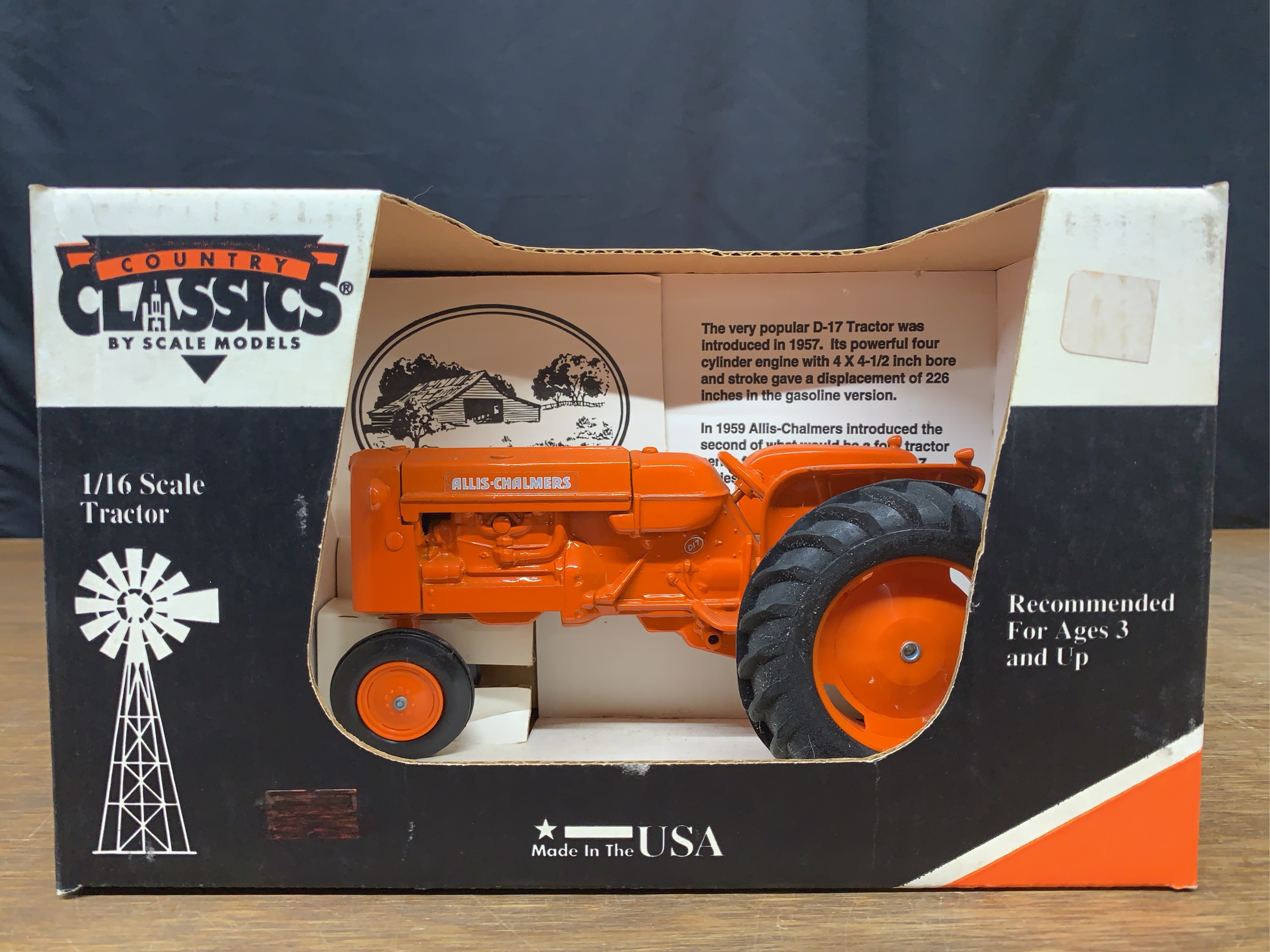 1/16 scale Allis Chalmers D17 tractor NIB made by Scale Models. Box shows wear and staining. Stock # FF-0198.