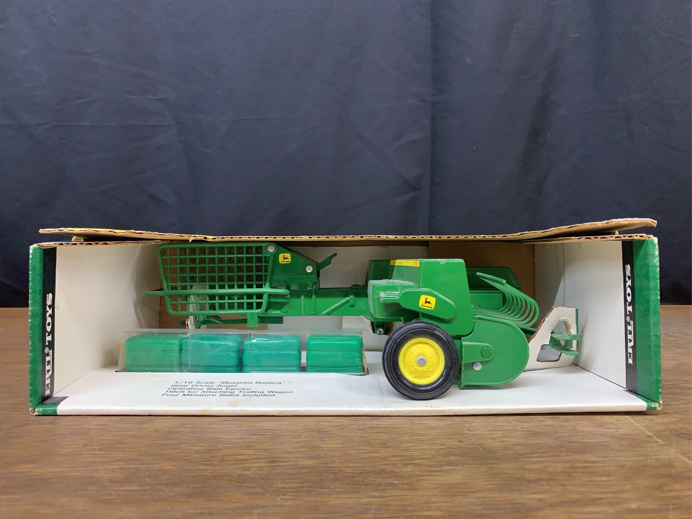 1/16 scale John Deere baler NIB made by Ertl. Harder to find version with green pickup and bale thrower. Good condition. Stock # 585.