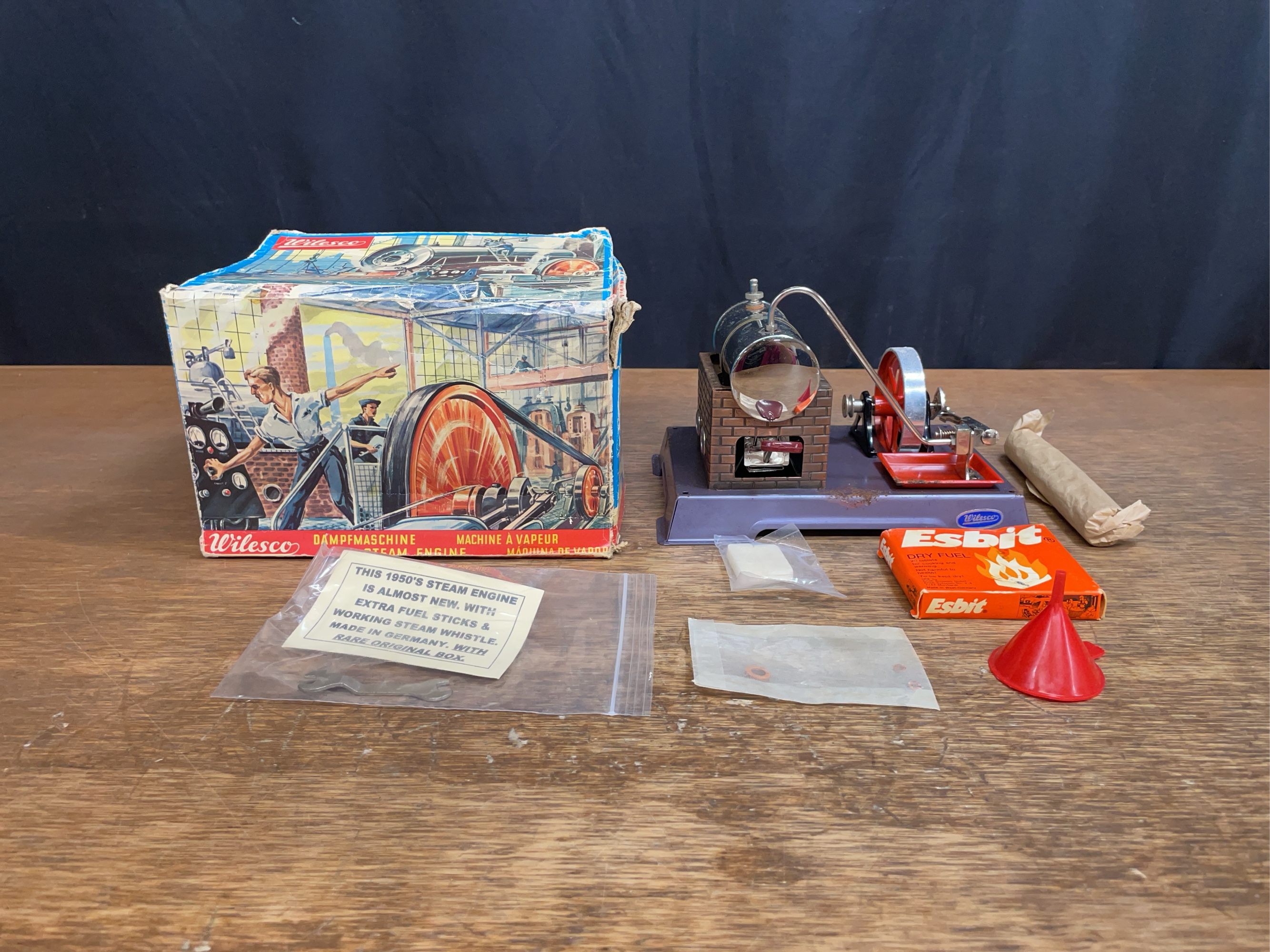 Stationary steam engine and accessories made by Wilesco. Includes box.