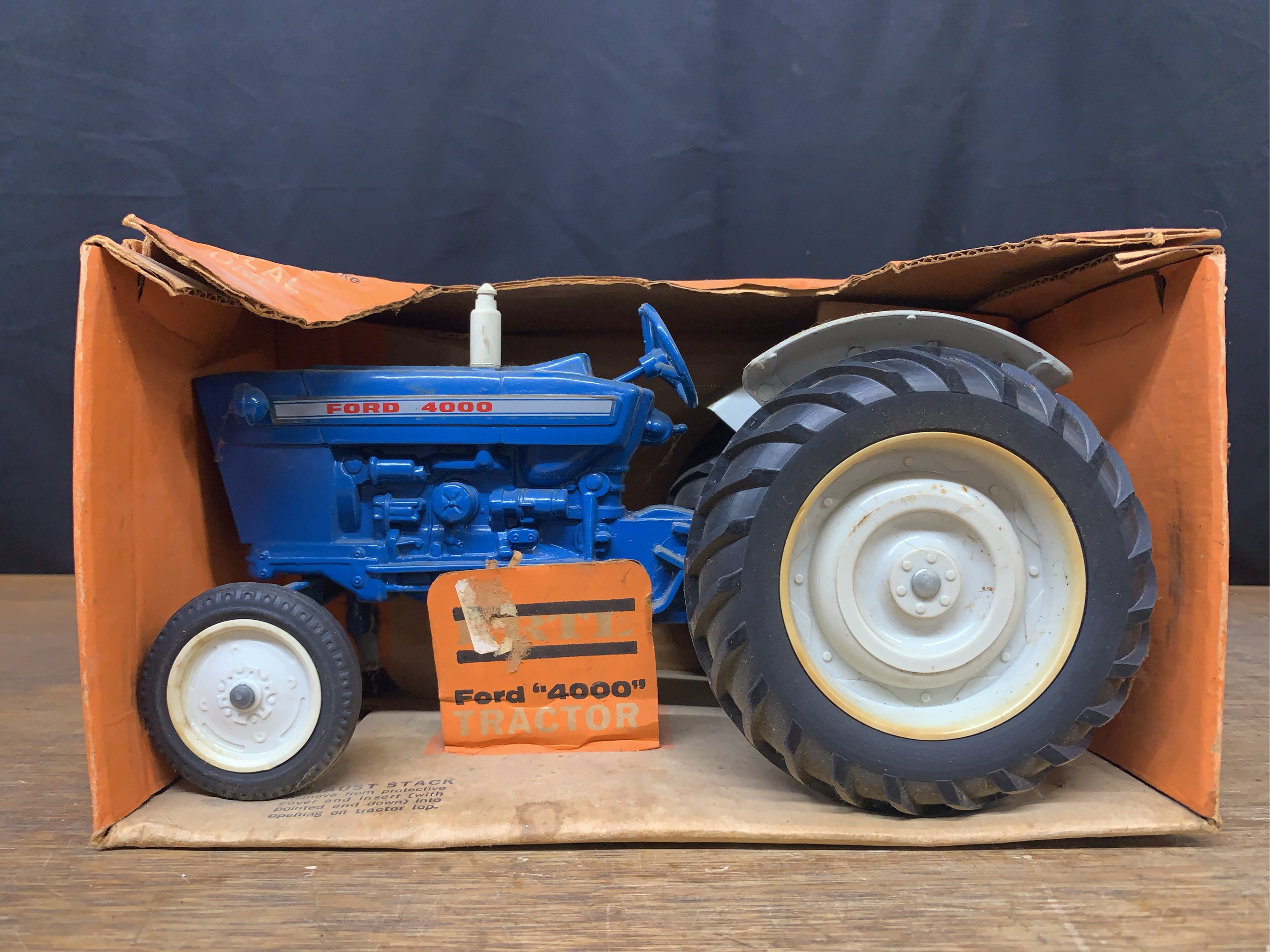 1/12 scale Ford 4000 tractor NIB made by Ertl. Box shows heavy wear, staining, and crushing. Stock # 805.