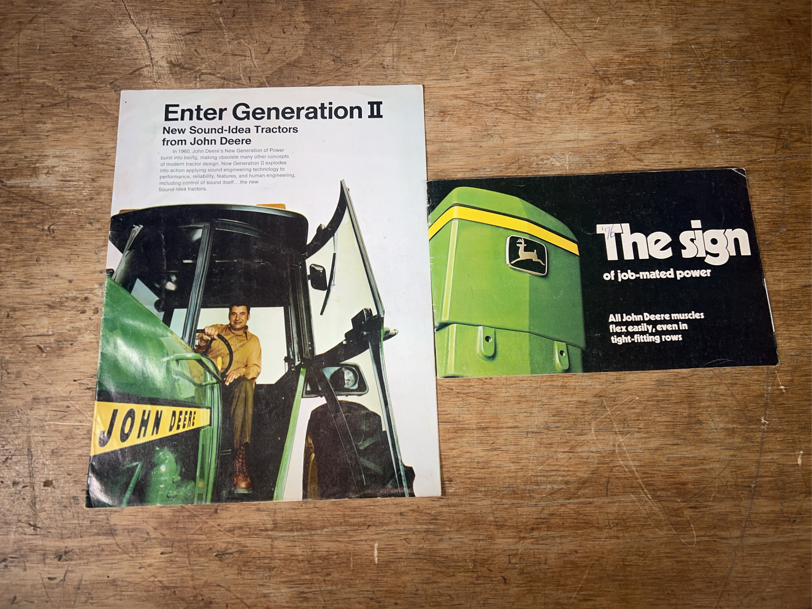 Two John Deere tractor sales literature. Both show wear.