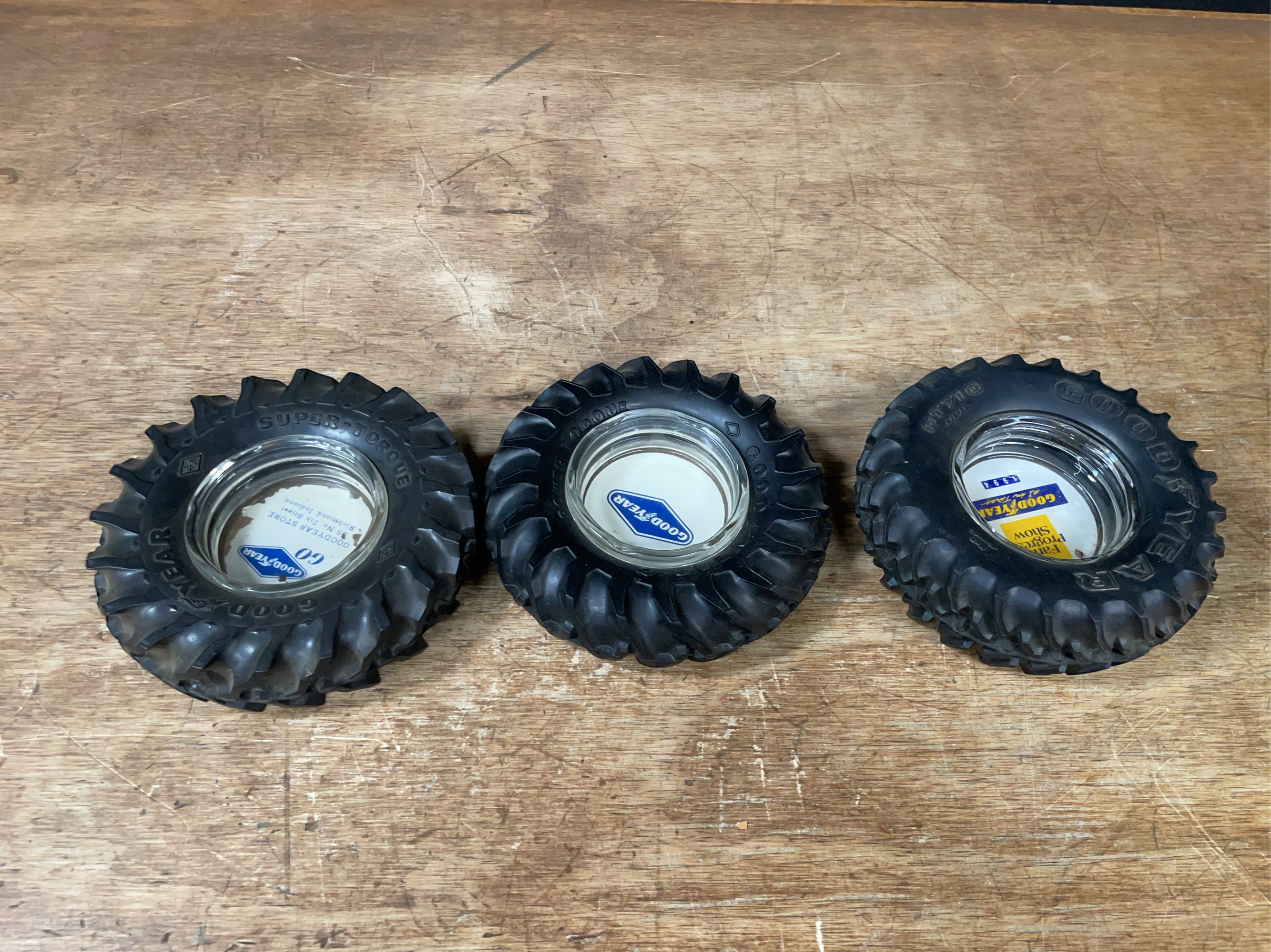 Lot of 3 Good Year tractor tire ashtrays. Varying condition.
