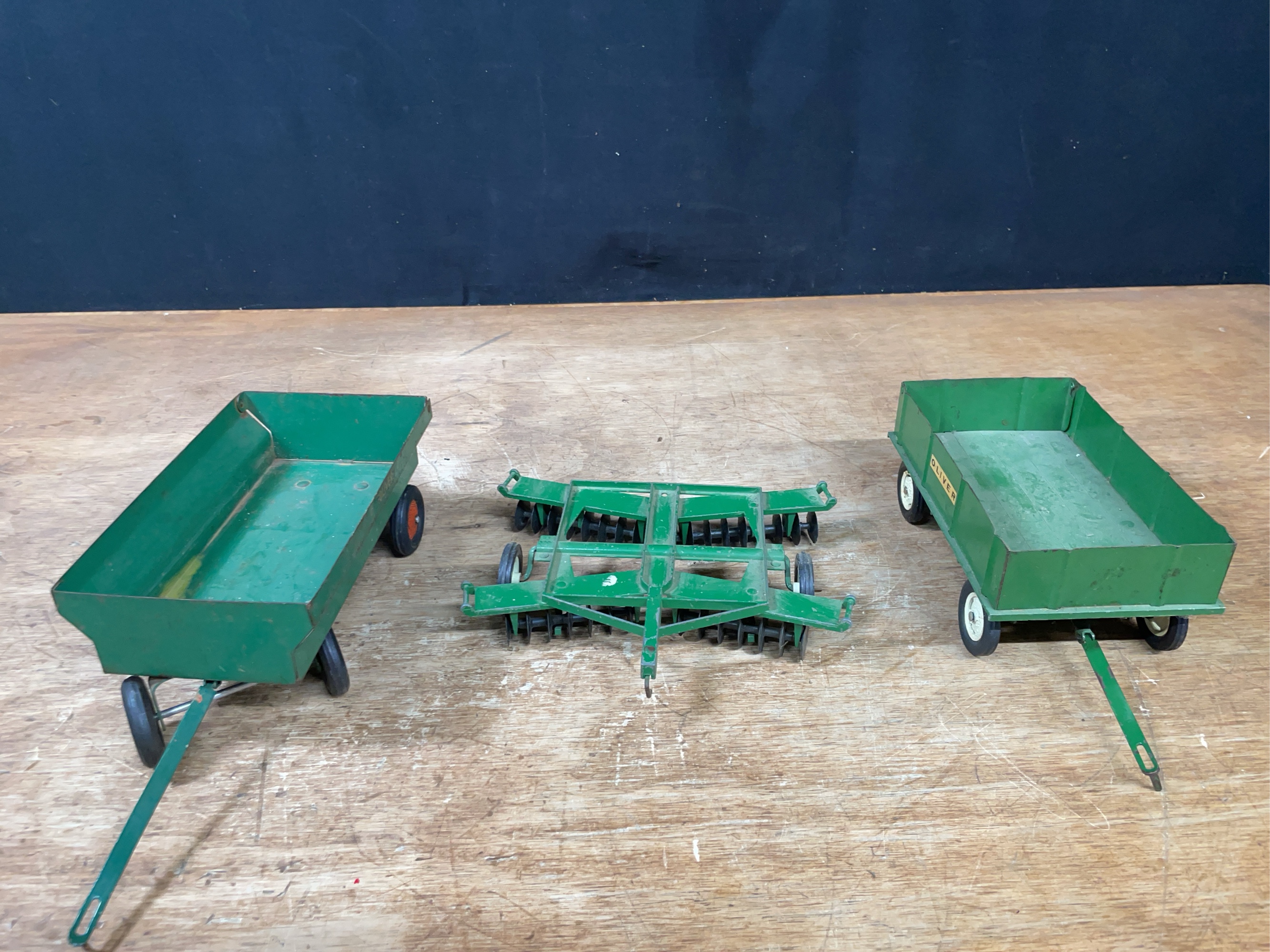 1/16 scale Oliver wagons and disk. Varying condition.