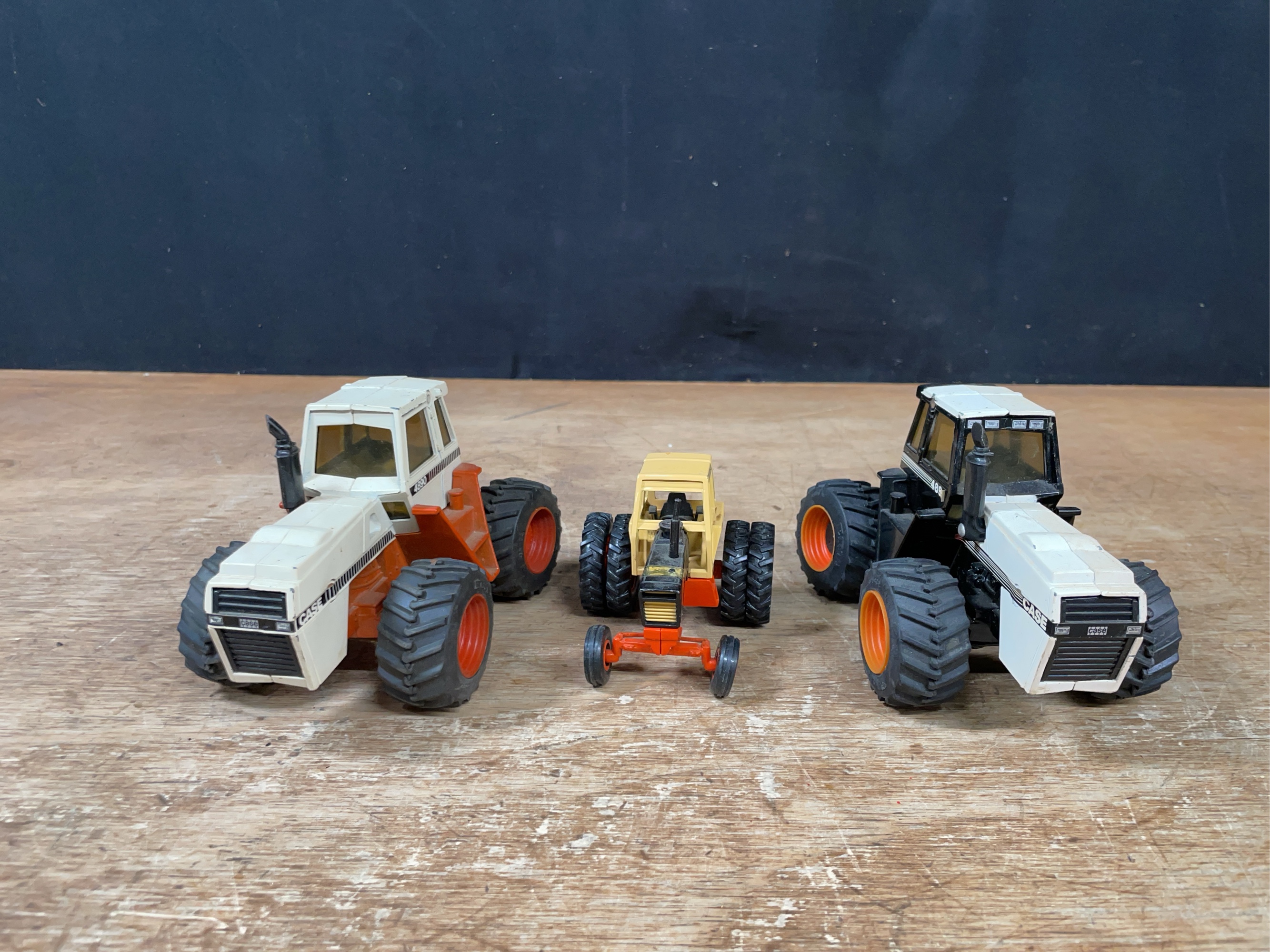 Lot of three 1/32 + 1/43 scale Case tractors made by Ertl. Varying condition.