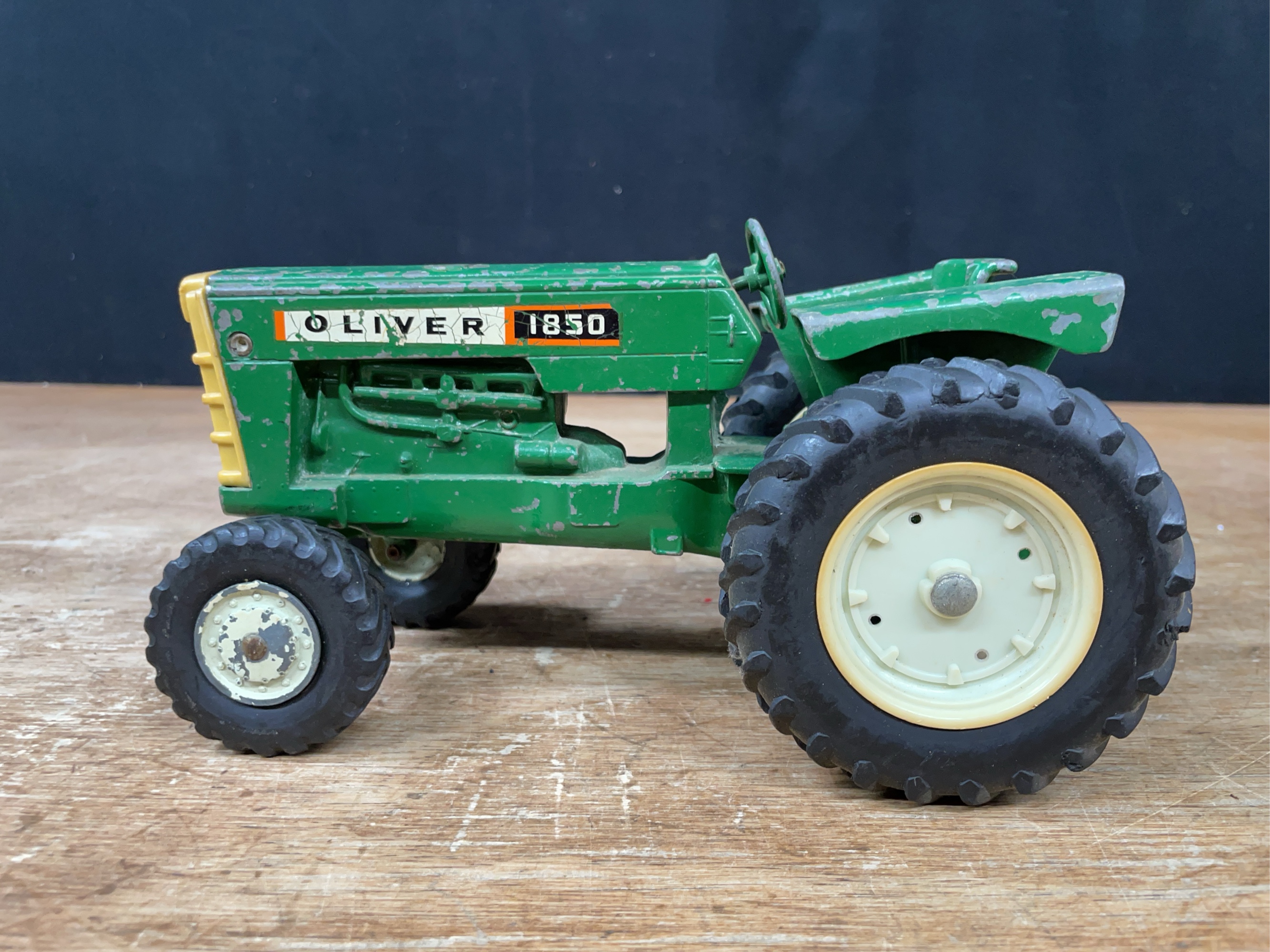 1/16 scale Oliver 1850 fwa tractor made by Ertl. Plastic rear rims and grill. Shows Wear and paint loss.