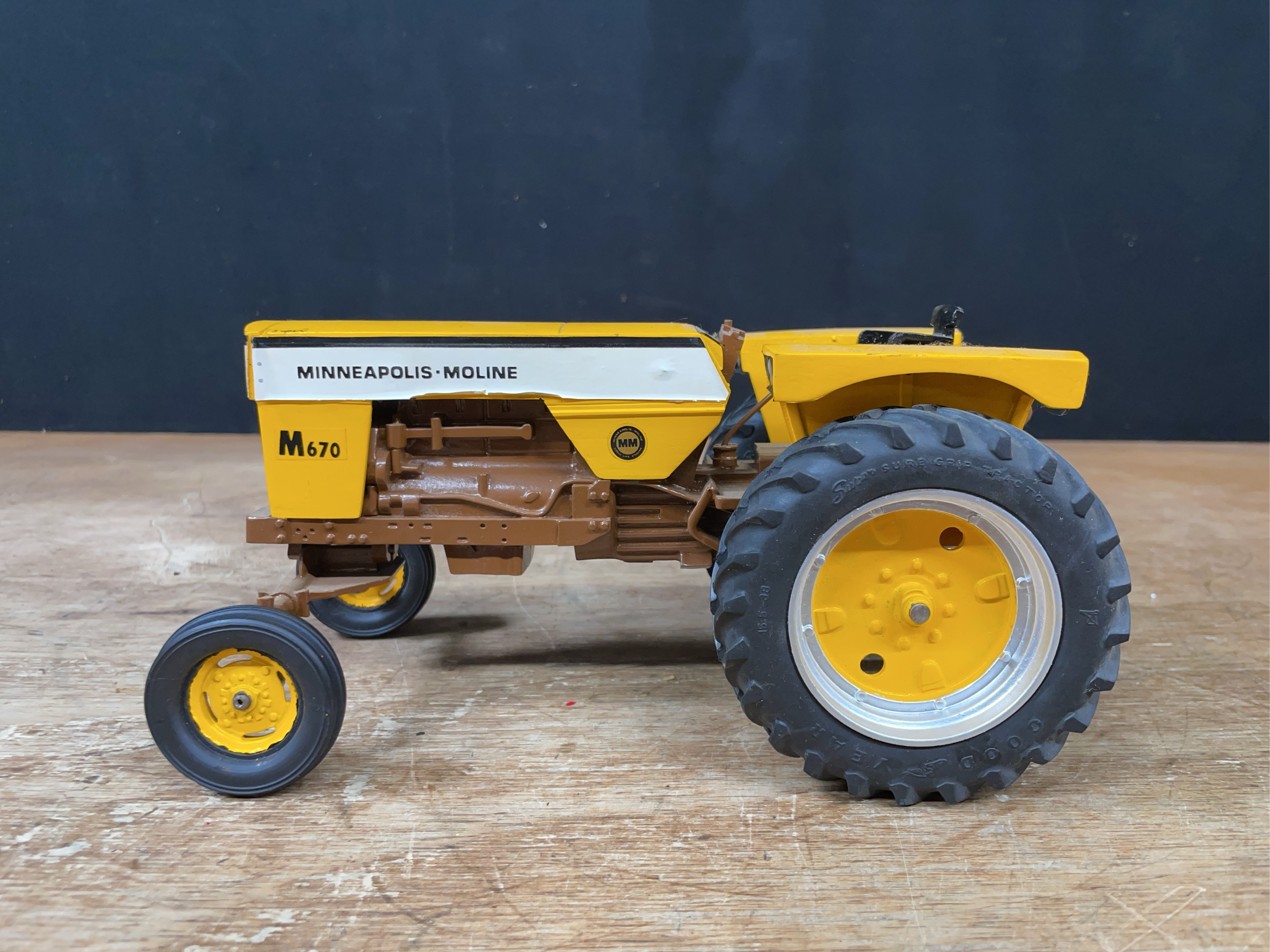 1/16 scale Minneapolis Moline M670 tractor made by Cottonwood Acres. Missing steering wheel, muffler, and air cleaner. Decals peeling.