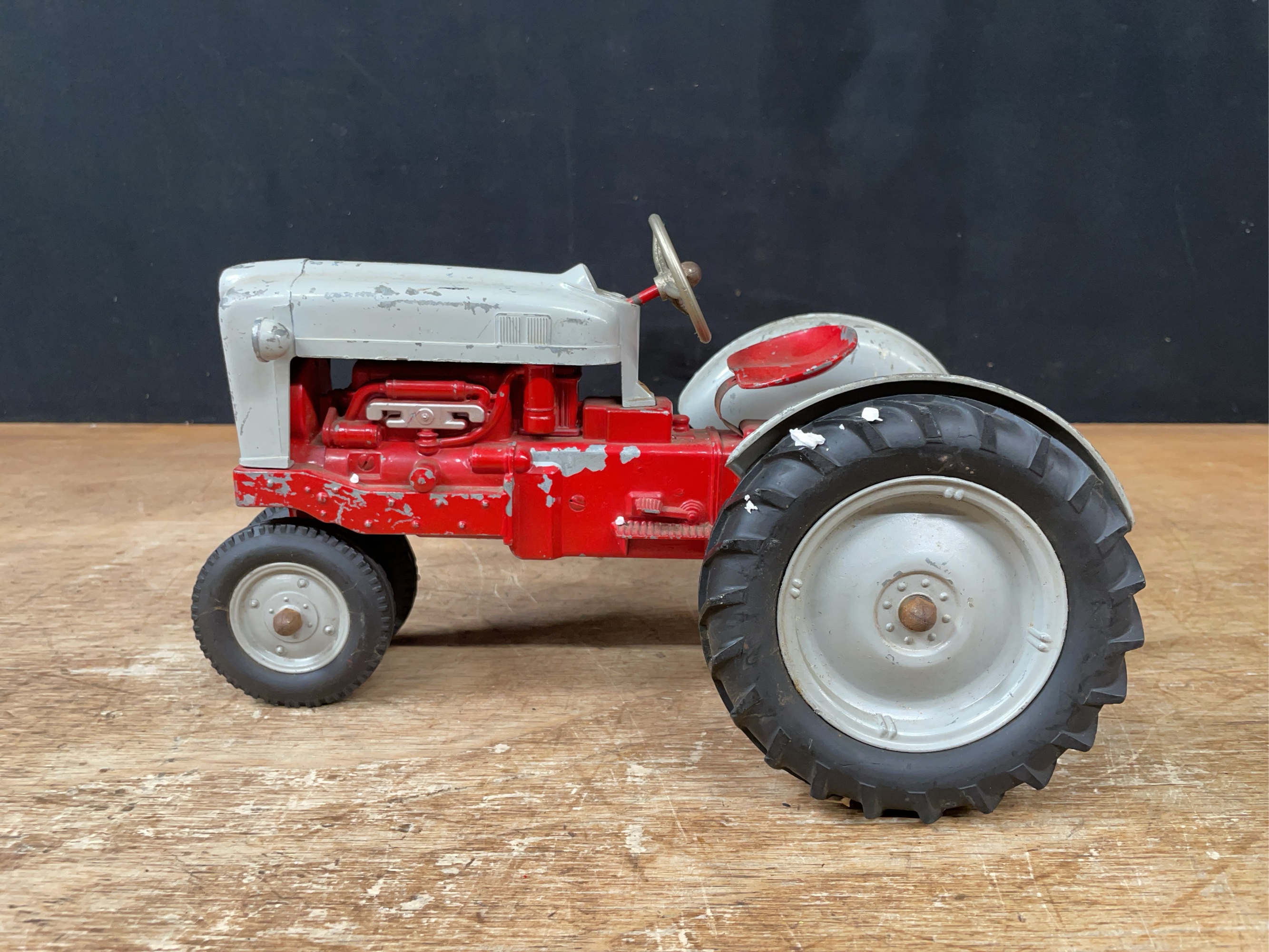 1/12 scale Ford 900 tractor made by Hubley. Shows wear and paint loss.
