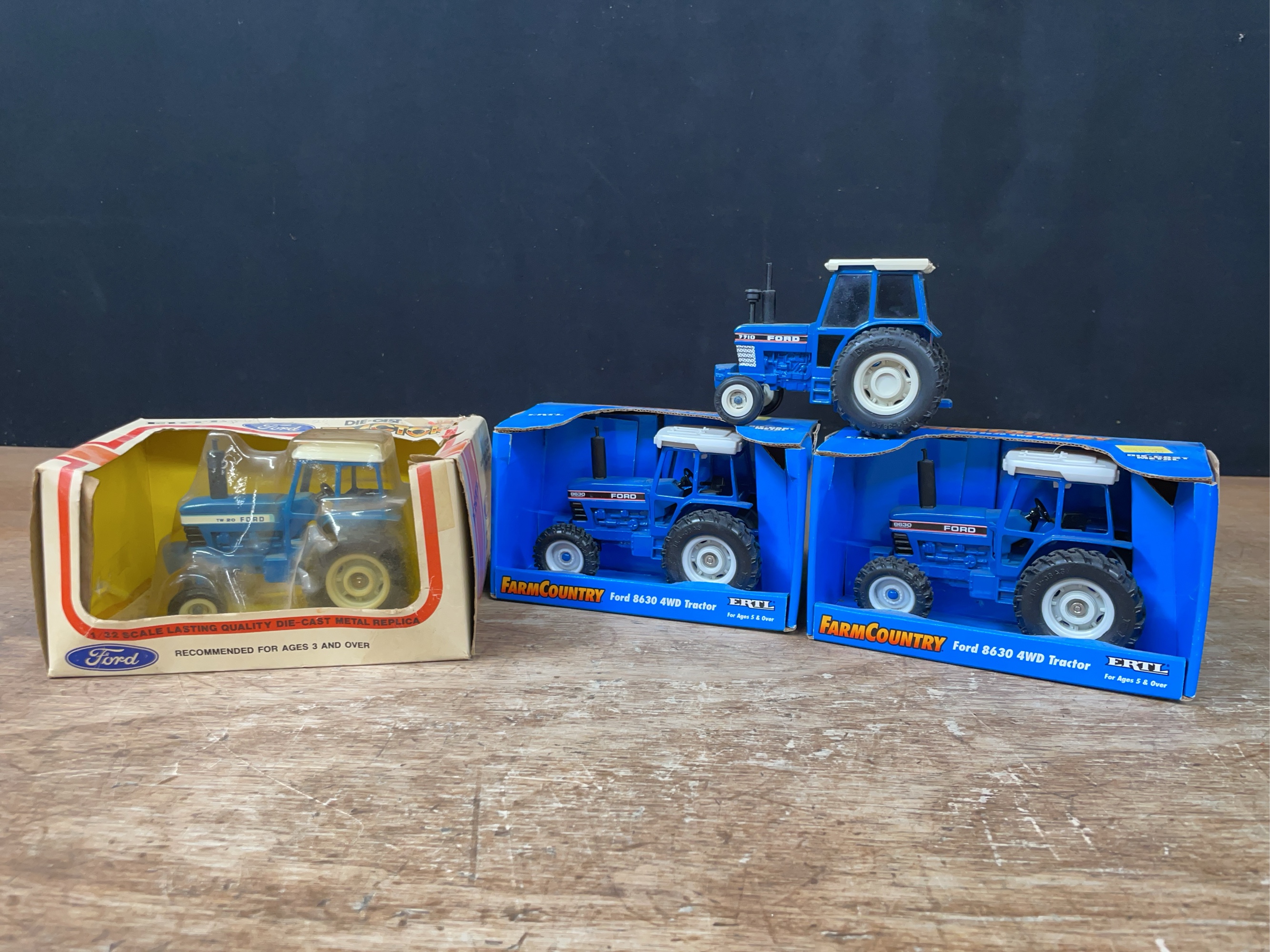 Lot of four 1/32 scale Ford tractors made by Ertl. Varying condition.