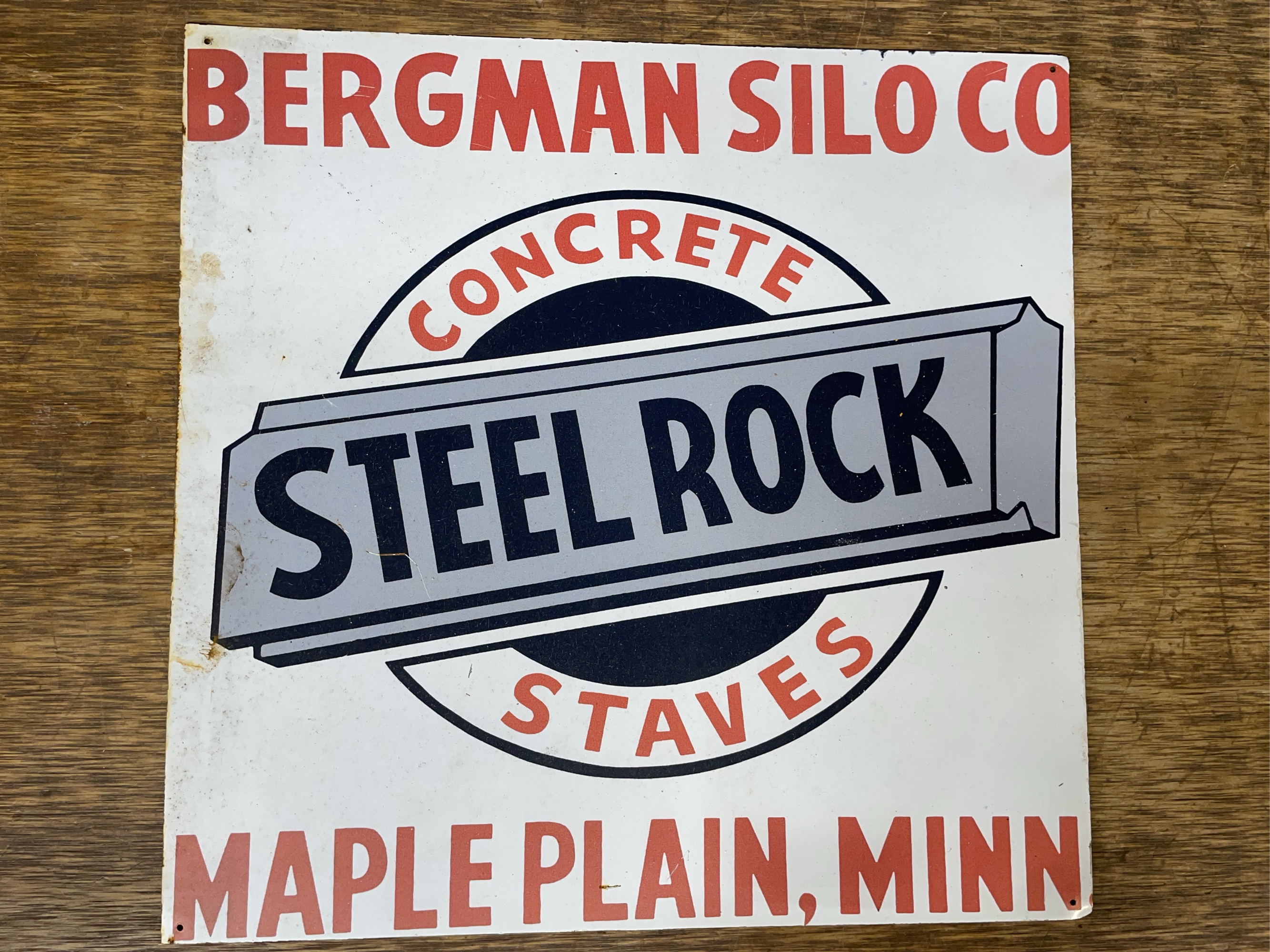 Steel Rock Concrete Silo Staves SST sign. 13 3/4" x 13 1/4". Shows wear, fading, and some rust.