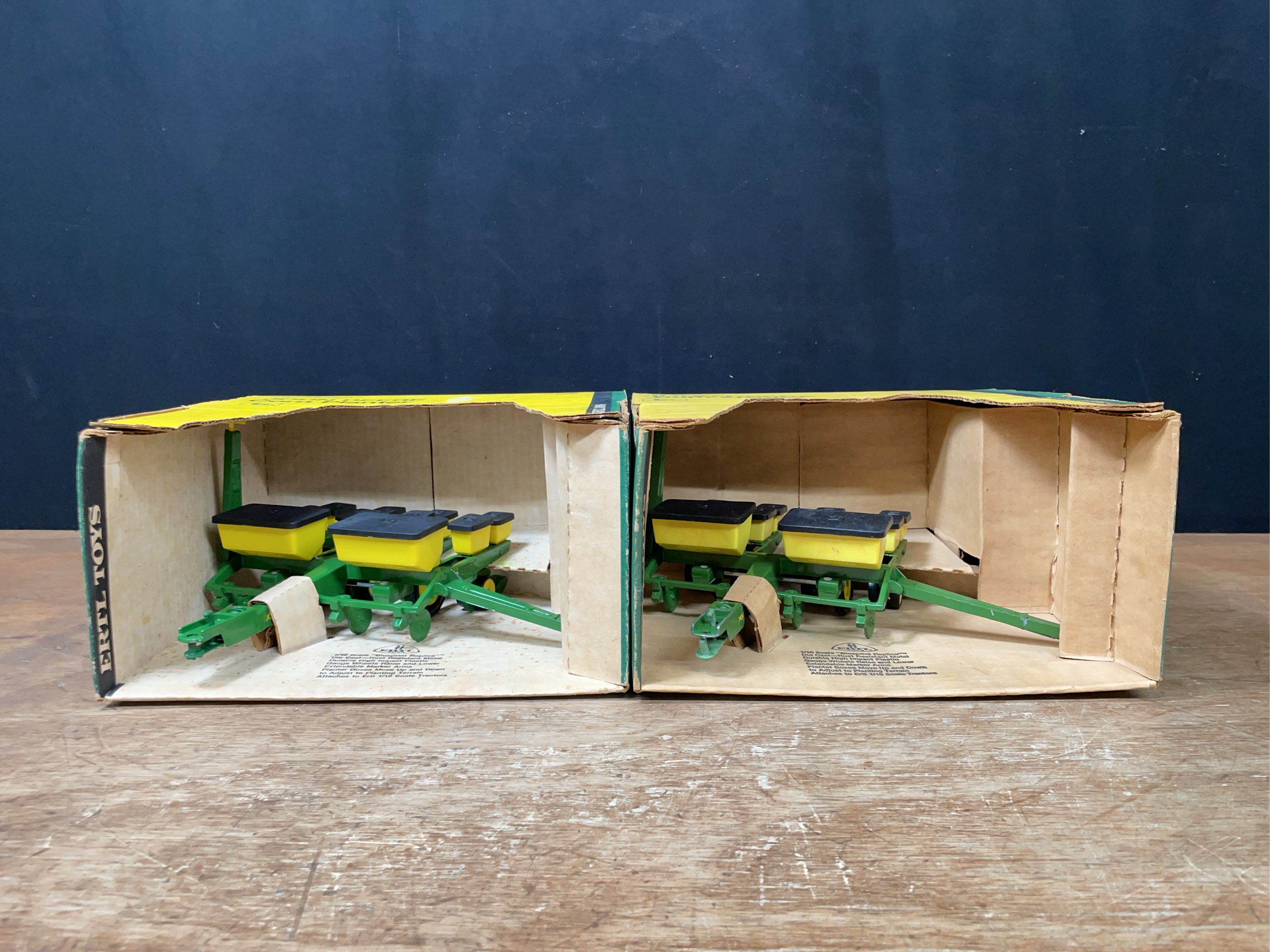 Two 1/16 scale John Deere corn planters NIB made by Ertl. Both boxes show varying levels of wear and staining. Stock # 595.