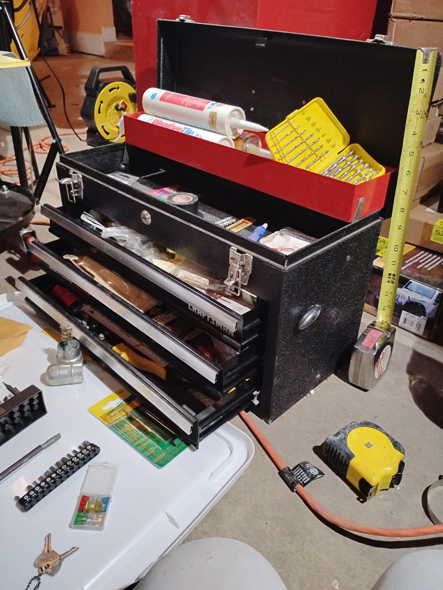 Tool box top bin with 3 lower drawers, the keys are with the box, 20 1/2"L x 12"T x 8 1/2"D mixture of all kinds.