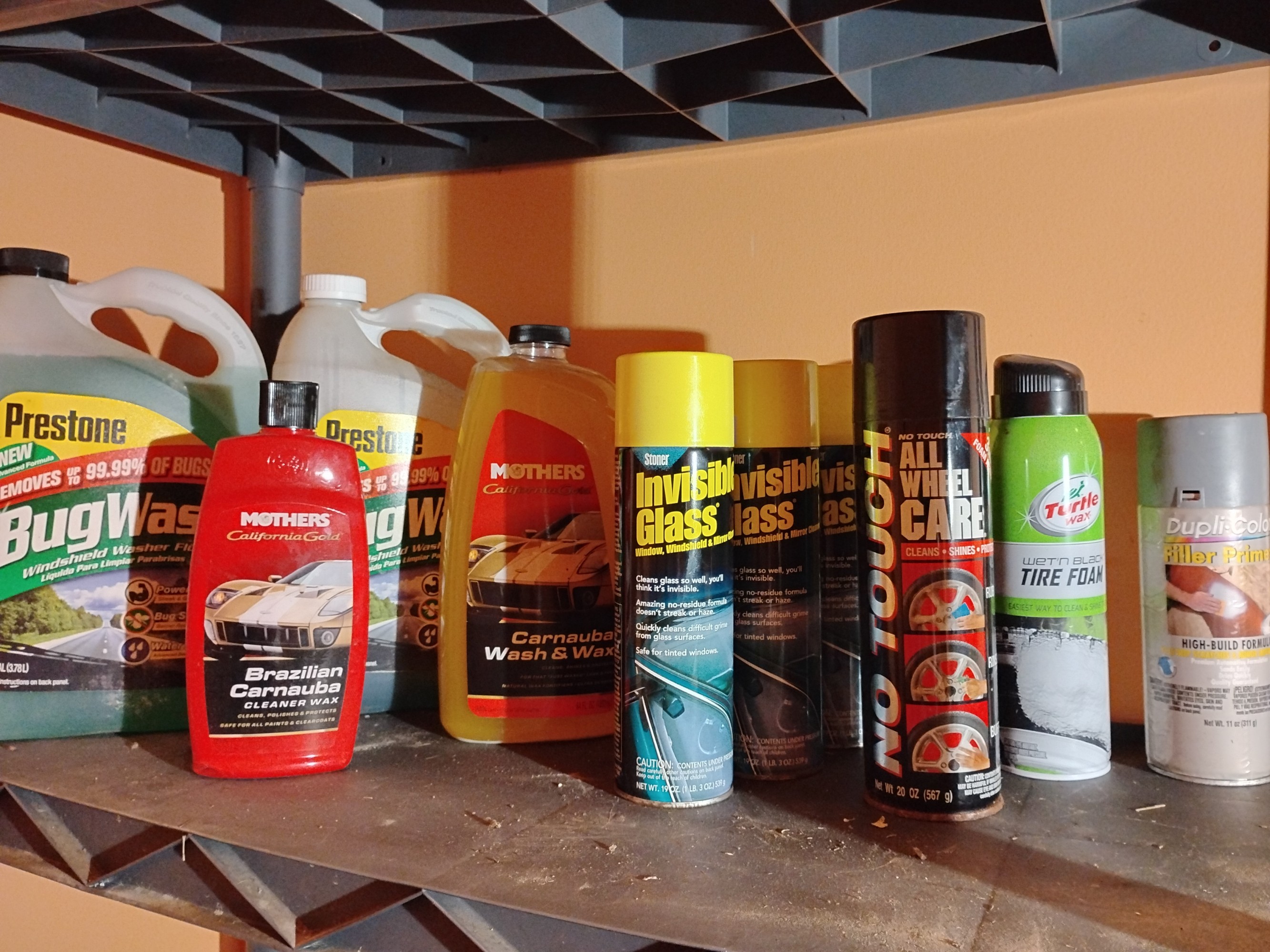 Assortment, 1 1/2 gal. Prestone Bug Wash windshield washer fluid, 1 full 16 oz. Mothers Brazilian Carnauba cleaner wax, 1 full 64 oz. Mothers Carnauba wash & wax, 2 1/2 19 oz. cans Stoner Invisible Glass window, windshield, mirror cleaner, 1 full 20 oz can No Touch All Wheel Care 3 in 1, 1 full 18 oz. can Turtle Wax wet n black Tire Foam, 1 full 11oz. can Dupli-Color Filler Primer High Build Formula. Full 12 oz. bottle Meguiar's Ultimate Black Plastic Restorer, 1/4 16 oz. spray bottle MOTHERS Showtime Instant Detailer, full 12 oz. bottle GOO ADHESIVE REMOVER