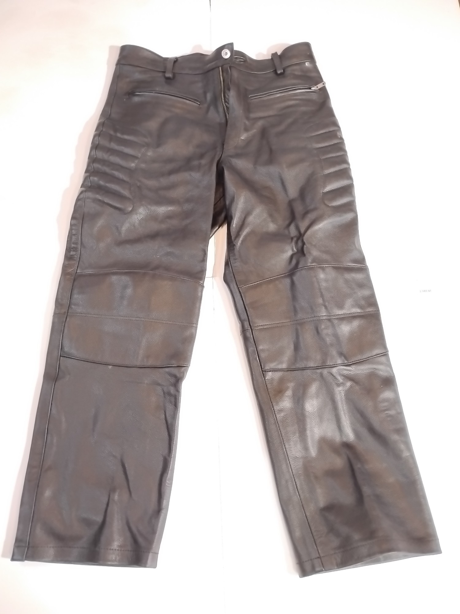 Leather Padded Motorcycle Riding Pants, no maker or size, but they are small. Some wear.