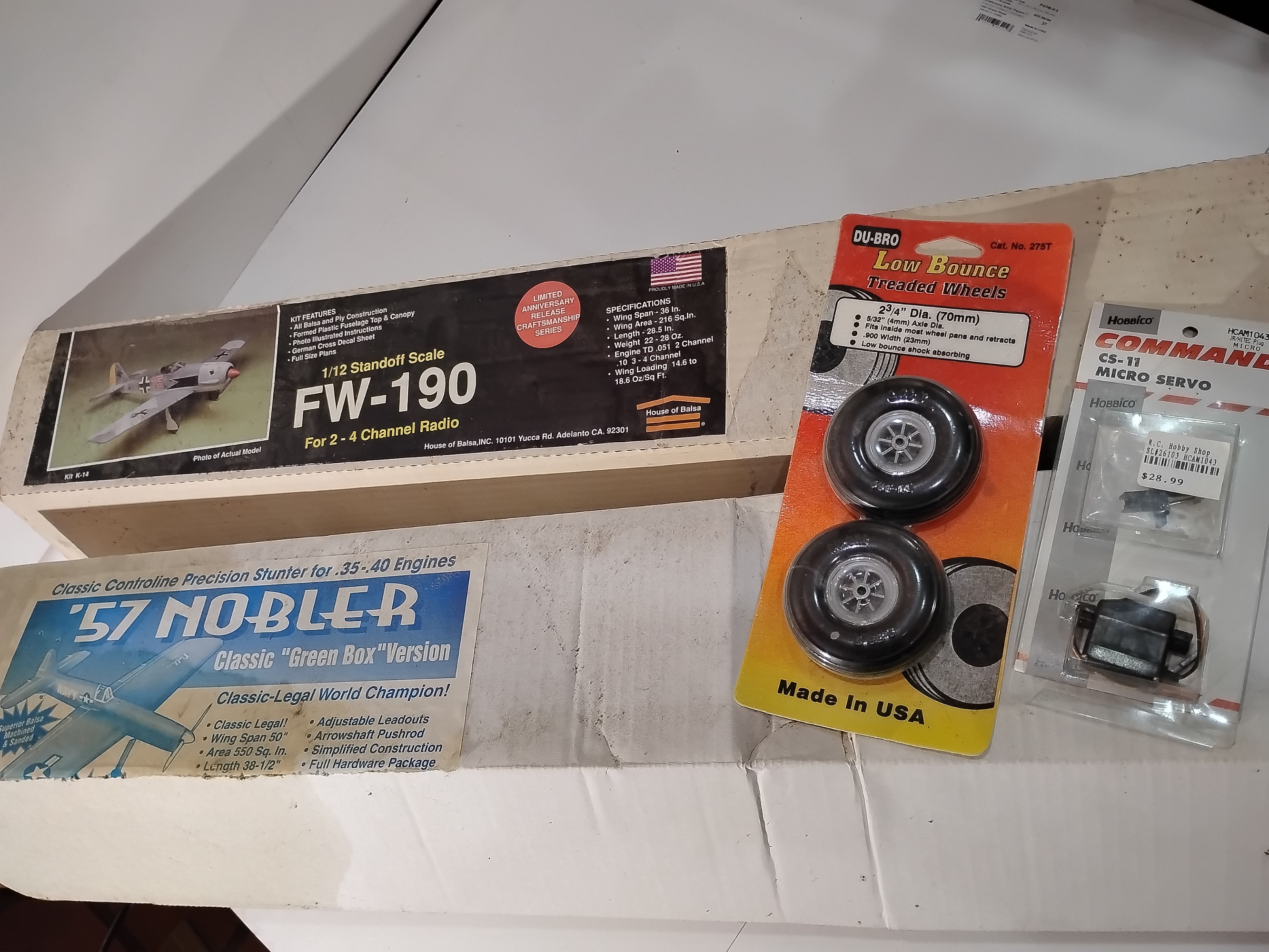 2 Model Planes, '57 Nobler "Green Box" seems complete, FW-190 may not be complete, 1 pack low bounce treaded wheels and CS-11 Micro Servo