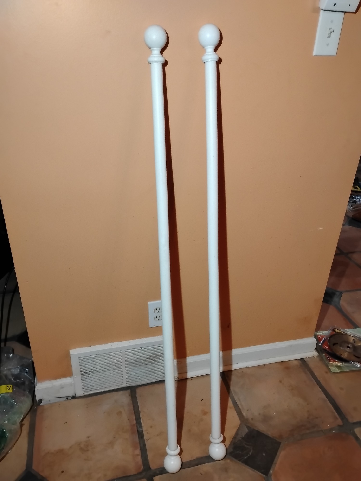 2 Curtain Rods, White Resin, 55 1/2" L, rod 1 1/2" across, ball 2 1/2" across