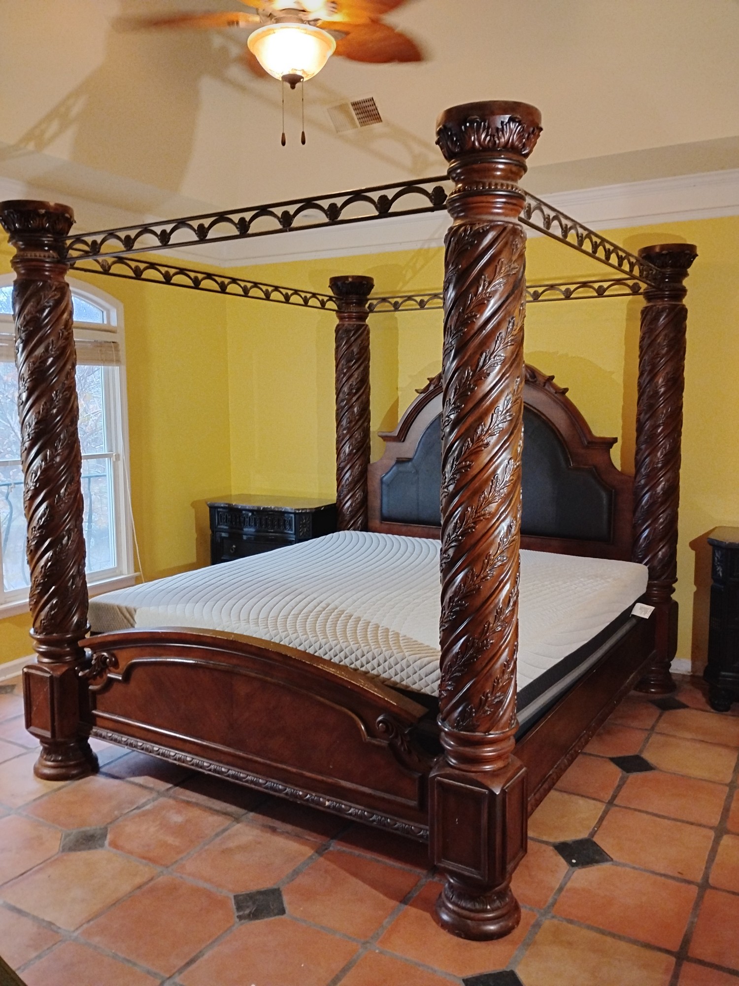 Ashley North Shore Dark Brown California King Poster Bed with Canopy, very ornate, B553-172, Mattress, Beautyrest Black Memory Foam with BLACK ICE on a LINAK adjustable mattress system platform underneath with remote. Dimensions 7' 6 3/4" T x 8' 5" L x 7' 2" W. Scratches on footboard and right side side rail, could be touched up with pen. Located on second floor. This piece is very large and heavy and BUYER IS RESPONSIBLE FOR REMOVAL, will have to be maneuvered around staircase.