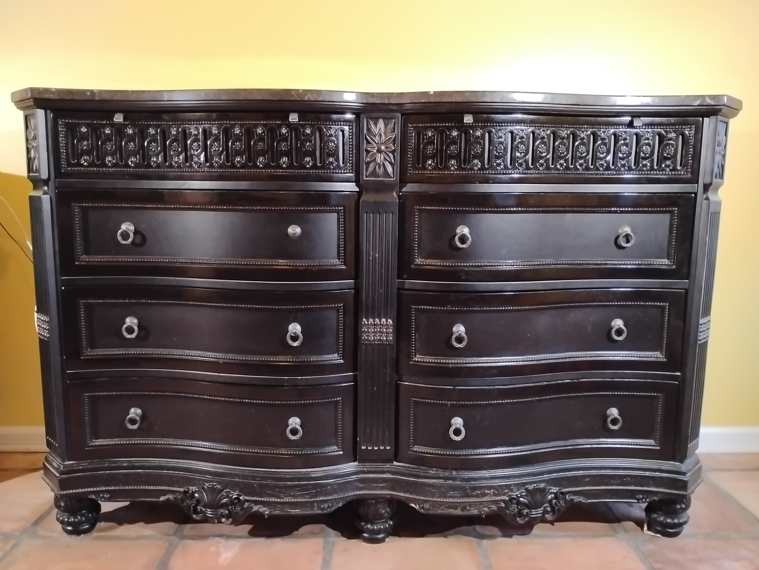 ***Missing drawer pull is found and fixed, photo to be updated shortly***Ashley Britannia Rose 8 drawer dresser Black Rose Finish with marble top. 44 1/4" T x 69 1/2" L x 20" D. Good condition. Heavy. Located on 2nd floor. This piece is really heavy and large and will have to be maneuvered around the staircase. BUYER IS RESPONSIBLE FOR REMOVAL.