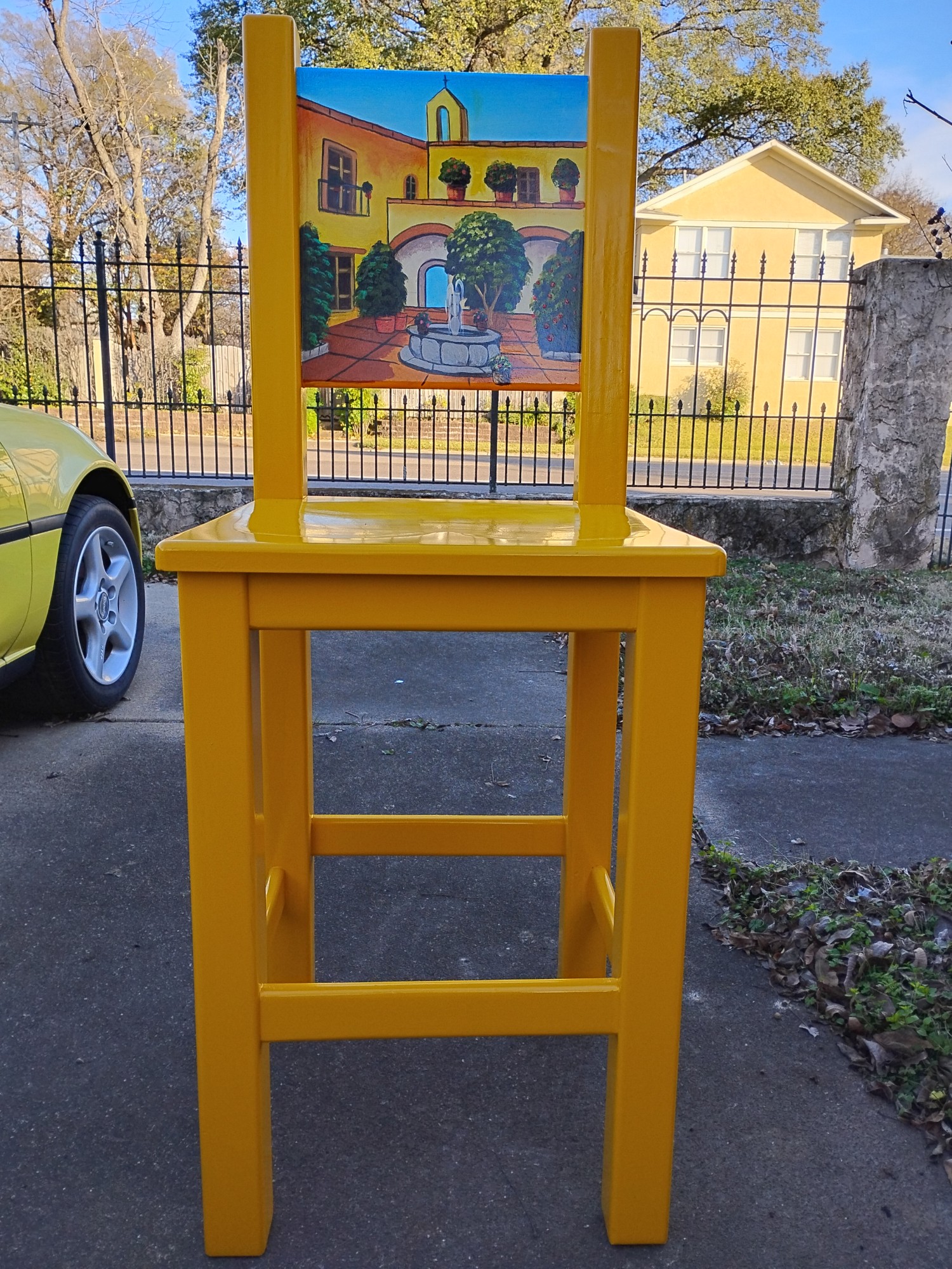 New Lacandona Tall Mexican Bar Chair, shiny finish, hand painted scene in back, back height 49 1/4" T, seat height 28", 19" W.