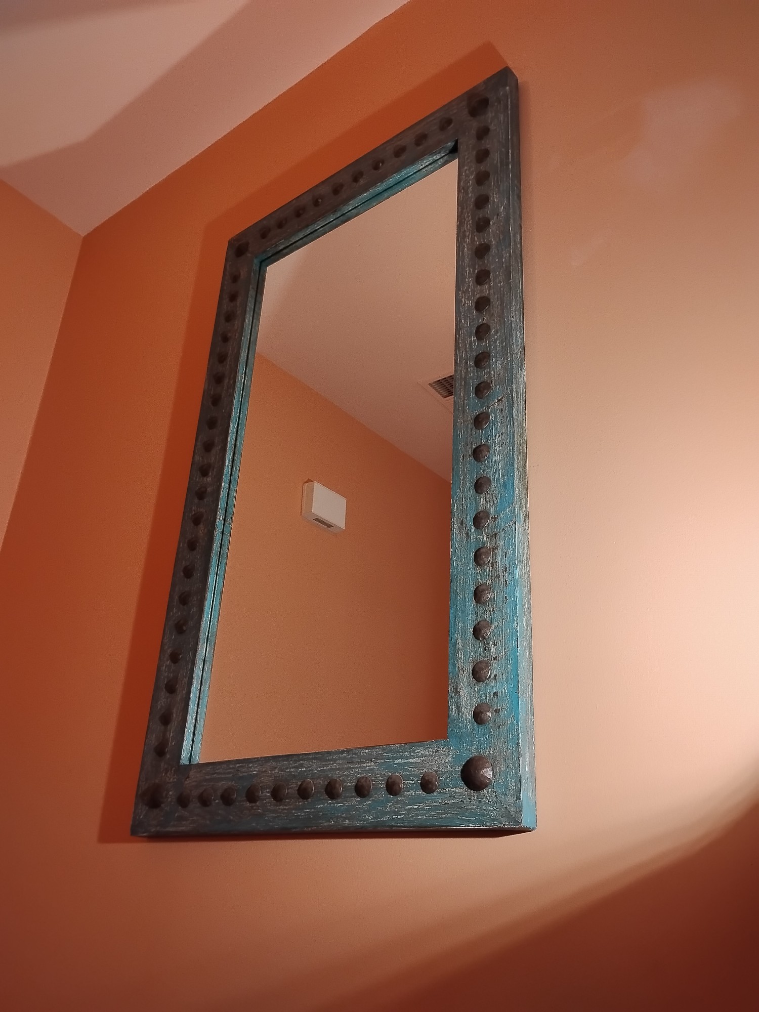 Bold Southwest Turquoise with hammered brads Mirror 48" x 28". This piece is large. BUYER IS RESPONSIBLE FOR REMOVAL.