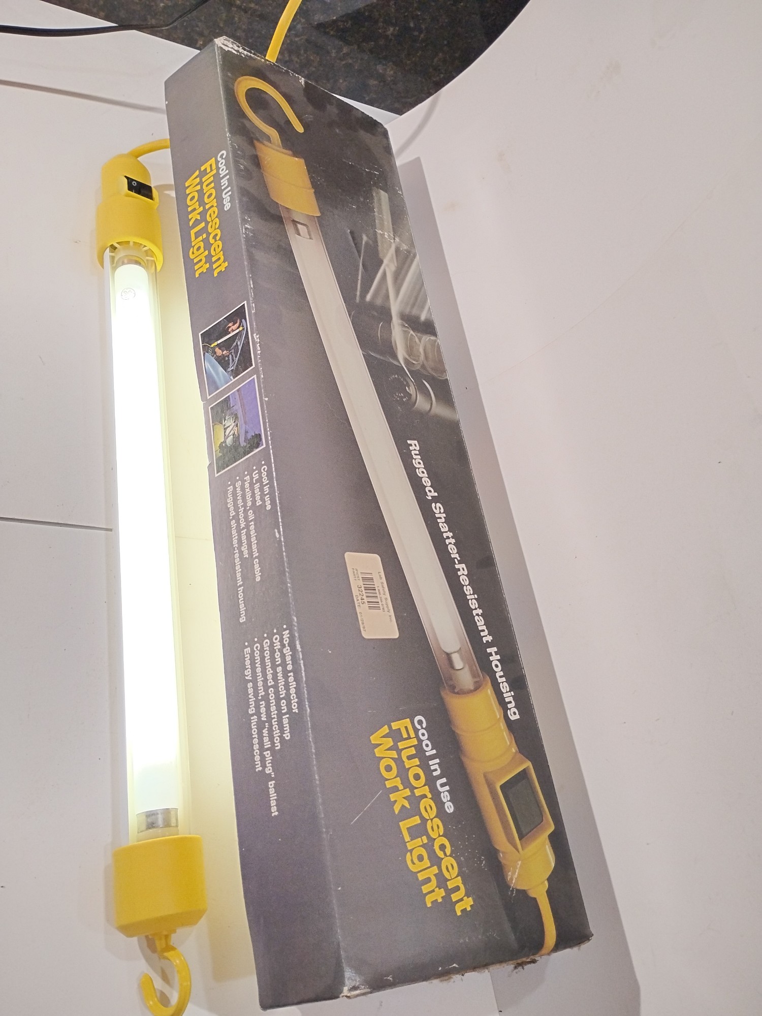 Fluorescent Work Light Cool In Use, Shatter-Resistant Housing, New in box, works. Hook allows hanging.