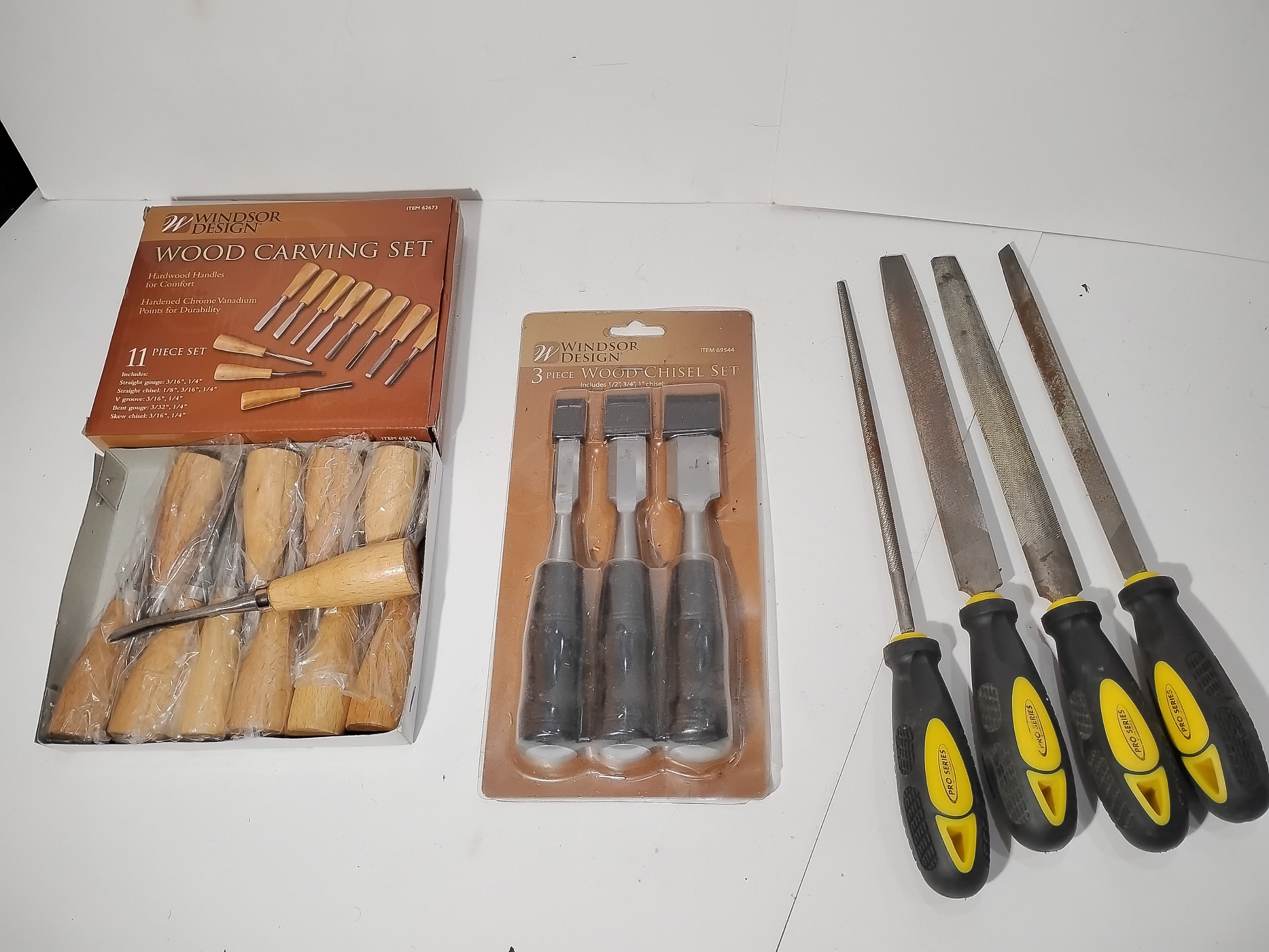 11 pc. Wood Carving Set new, 3 pc Wood Chisel Set new, 4 Files lightly used.