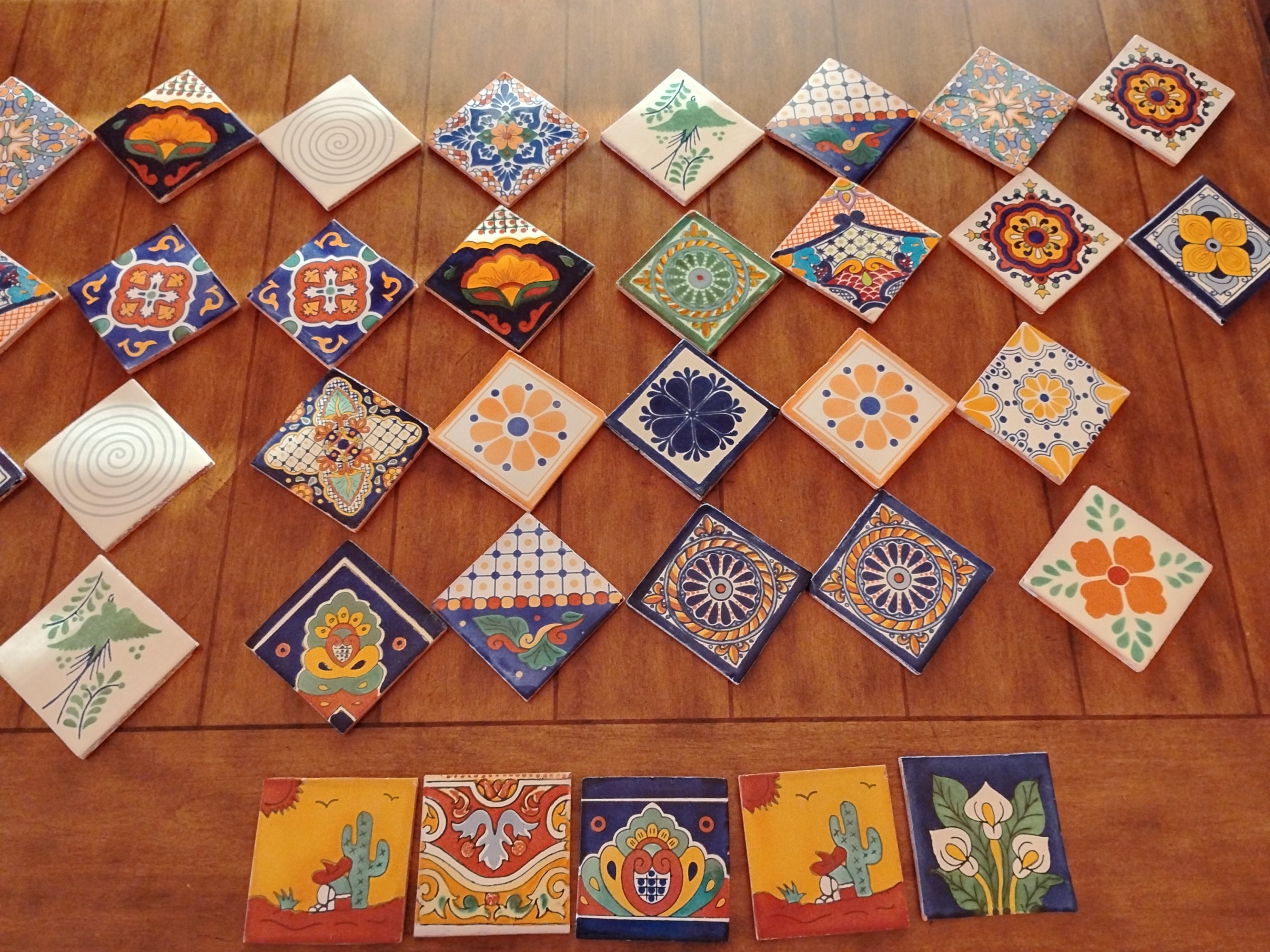 Mexican Tiles, Terra Cotta, Glazed, so many patterns, 4 1/8" x 4 1/8", eventually begin to repeat, 2 boxes, apprx 100 pcs. per box.