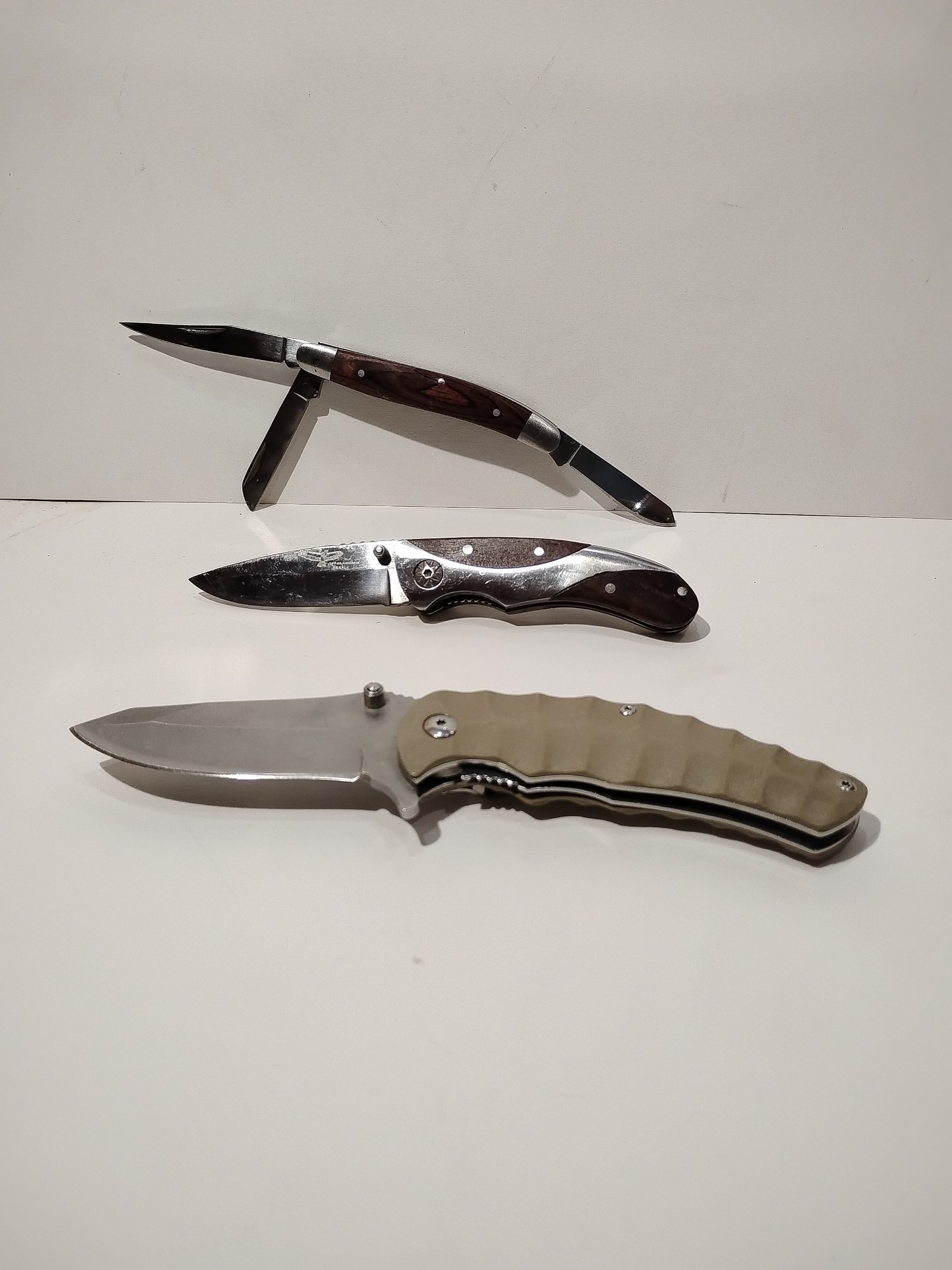 Assortment, Winchester 3 blade stockman wood handle, Appalachian Trail tactical liner lock, WalMart folding
