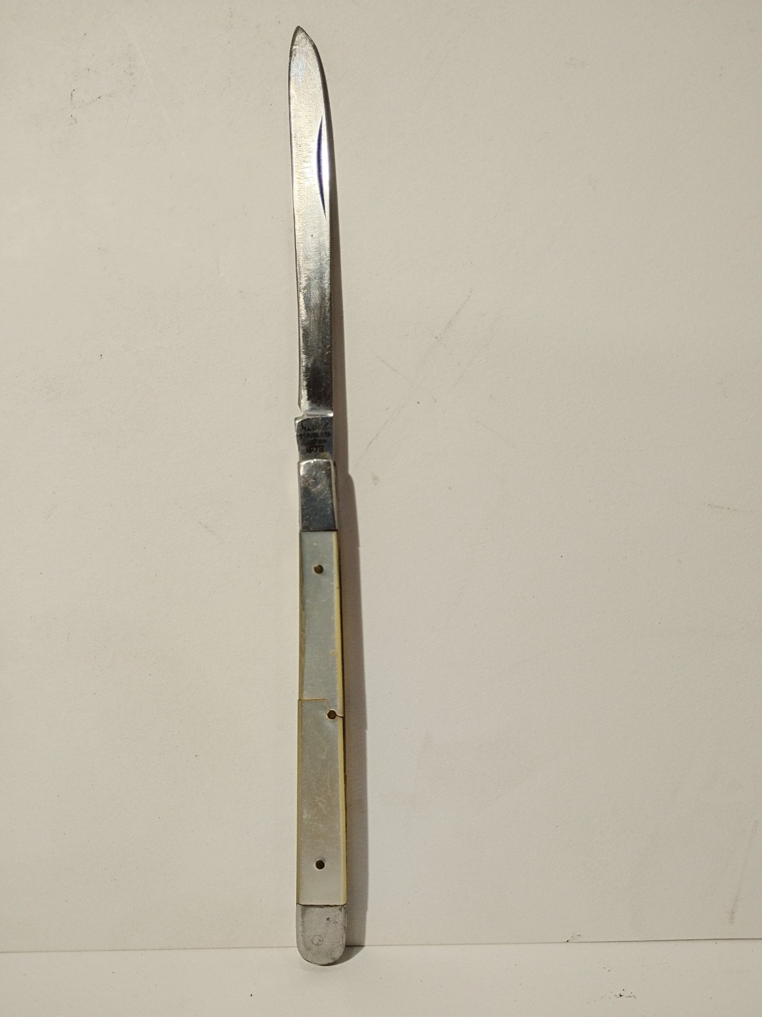 Vintage Sabre stainless steel Mother of Pearl handle, open length 7", closed length 4 1/4", handle cracked