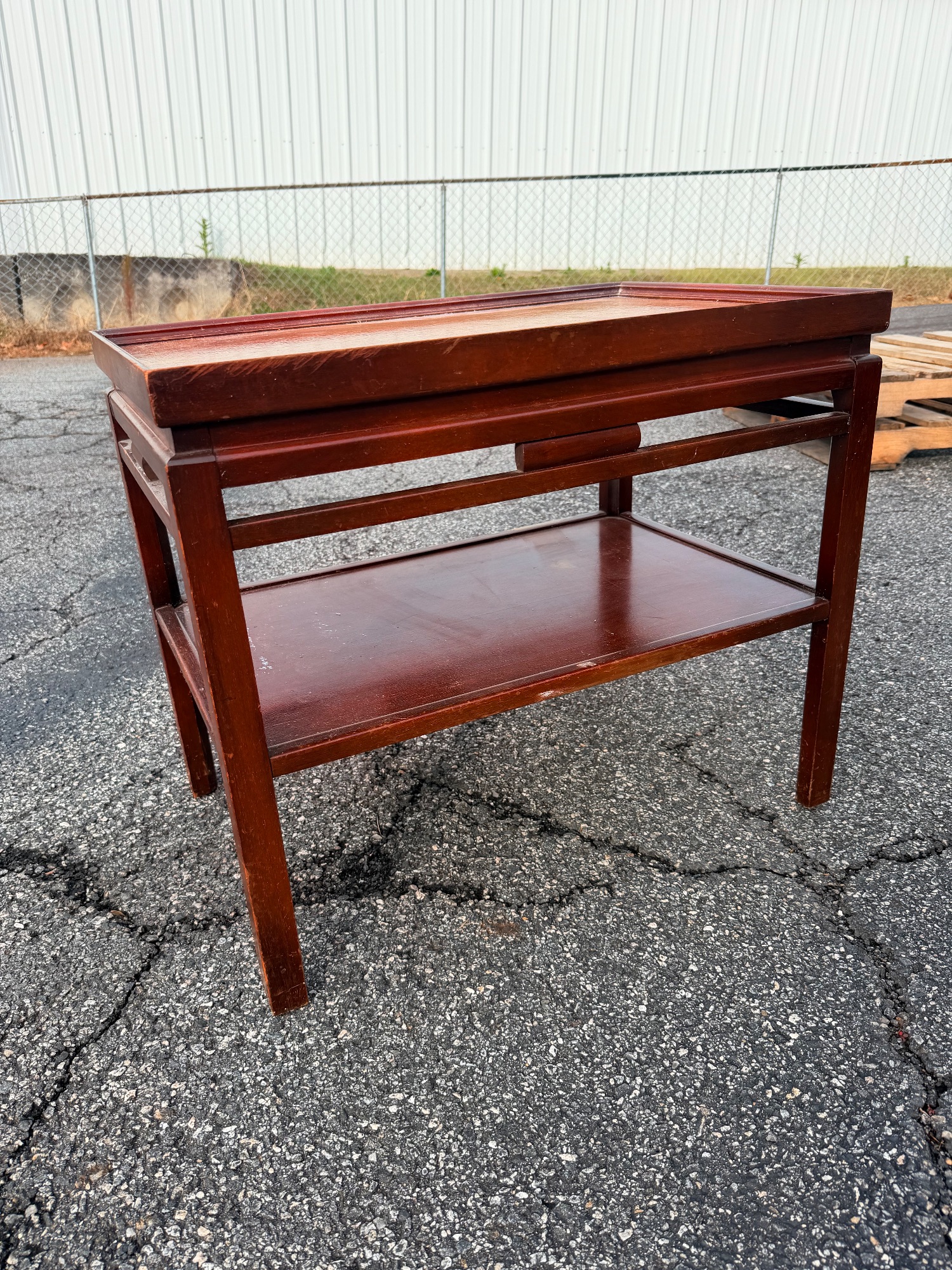 This delightful table adds a touch of understated elegance to any room! Featuring a handsome leather top with a decorative gold border, it also boasts a convenient lower shelf perfect for storing books, magazines, or your secret stash of snacks. See photos for condition and details.