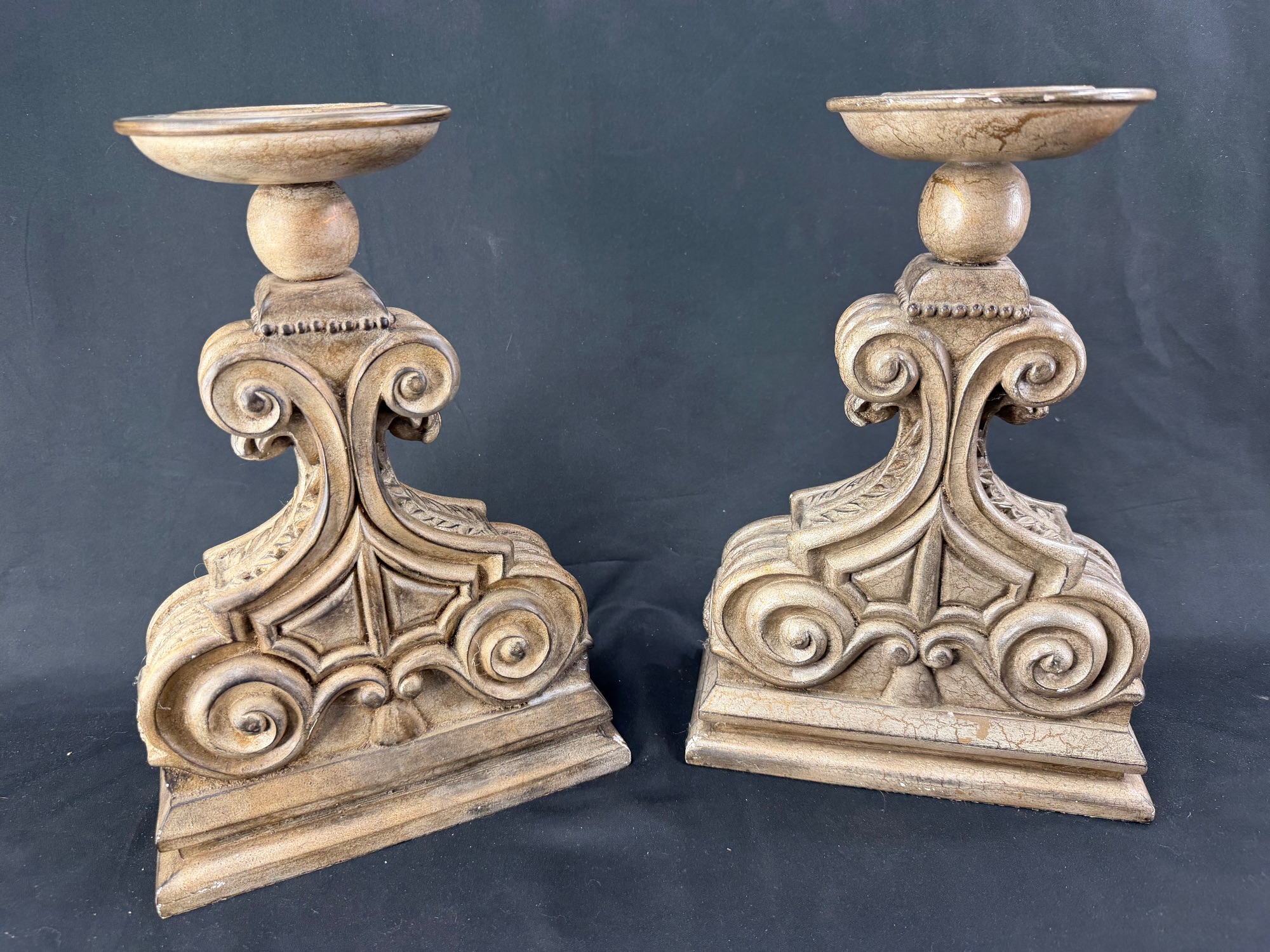Add a touch of timeless elegance to your space with this stately pair of candle holders. With their intricate scrollwork and neutral finish, they're sure to catch the eye and become a conversation piece. These elegant candle holders would be the perfect touch to add to any room. See photos for condition and details.
