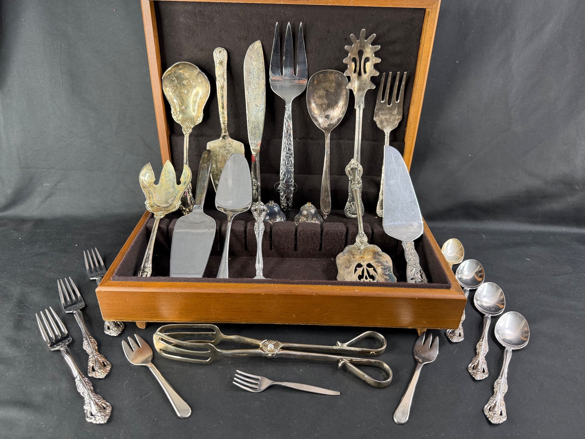 Feast your eyes on this collection of silverware! It comes in a nice wooden storage box and also includes salad serving tongs. Styles include 1916 Rogers Oneida Ltd and Oneida Stainless and more. Whether you're setting the table for a dinner party or just want to add some sparkle to your everyday meals, this silverware collection is sure to impress. See photos for condition and details.