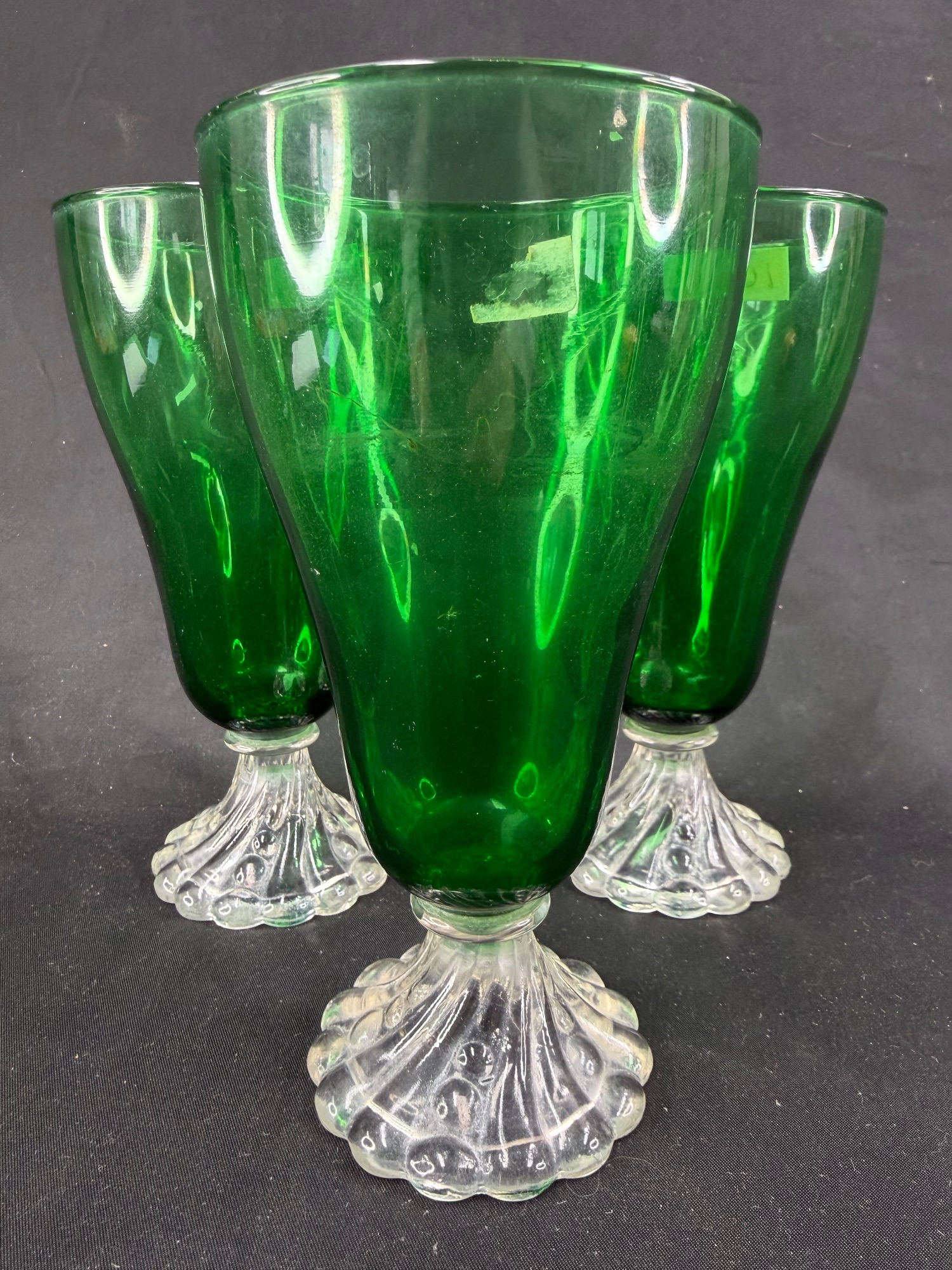 This listing presents a striking trio of Anchor Hocking Boopie Burple glasses in a vibrant green hue. These glasses feature a distinctive pedestal base. Perfect for adding a touch of character to any dining setting. Please refer to the images for a closer look at their condition and aesthetic details; they are as charming as they are functional.