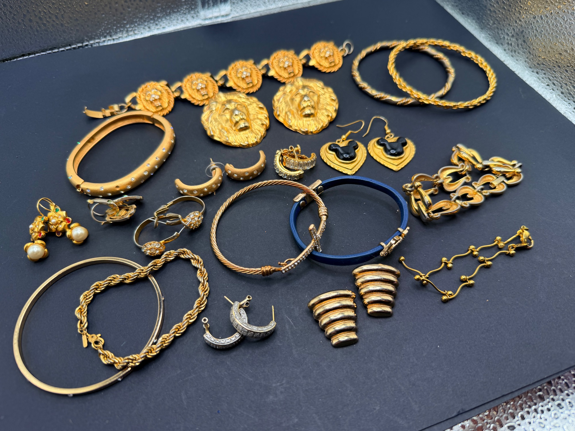 Feast your eyes on this dazzling collection of fashion jewelry! Overflowing with earrings, bracelets, and more, this lot offers a diverse array of styles. A perfect opportunity to add some sparkle to your collection. See photos for condition and details.