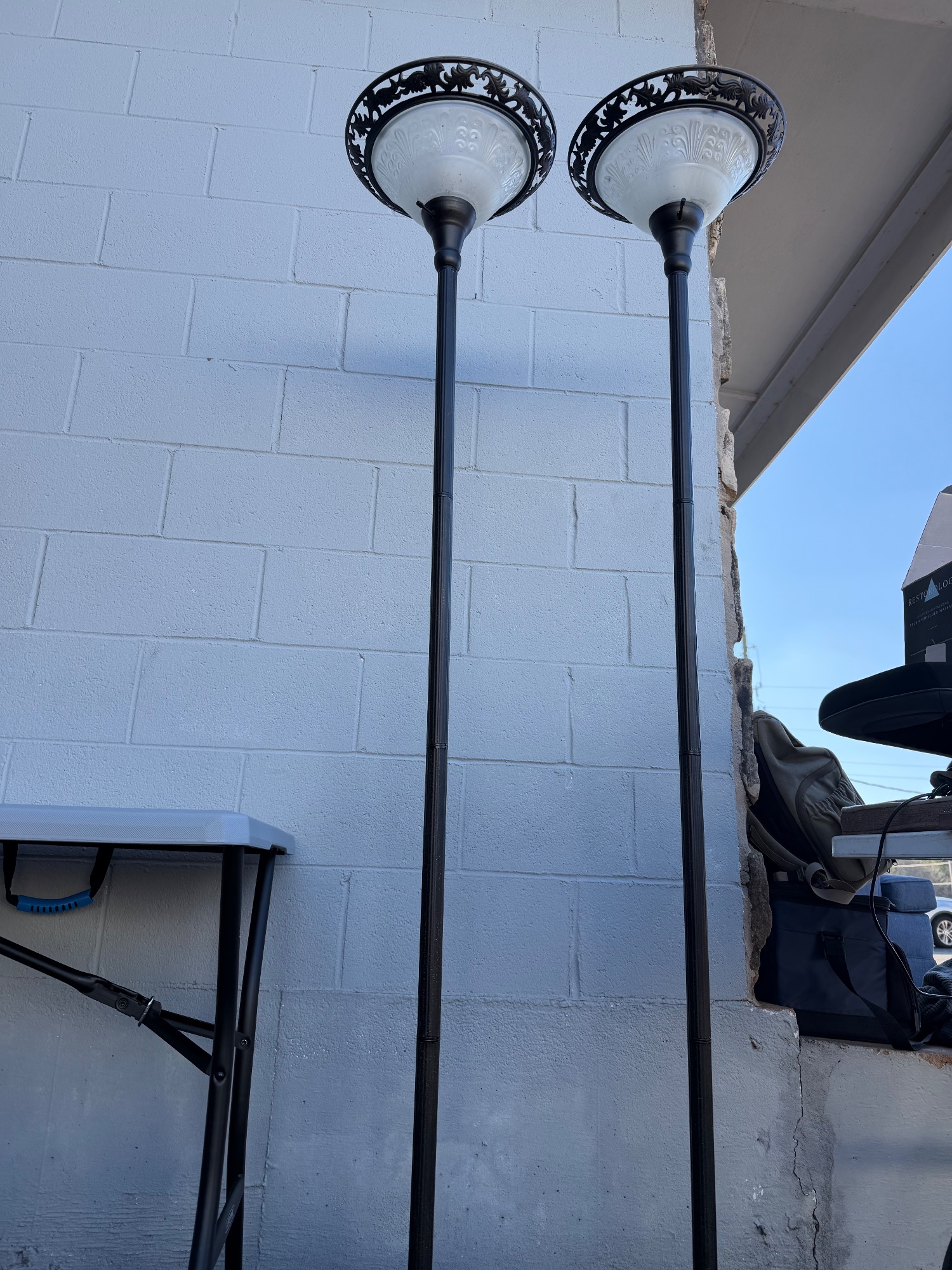 Cast a warm glow with this pair of floor lamps. These elegant lamps feature a detailed, filigree-style metal shade surround and fluted glass shades, standing on dark metal posts and decorative bases. They are sure to light up any room! See photos for condition and details.