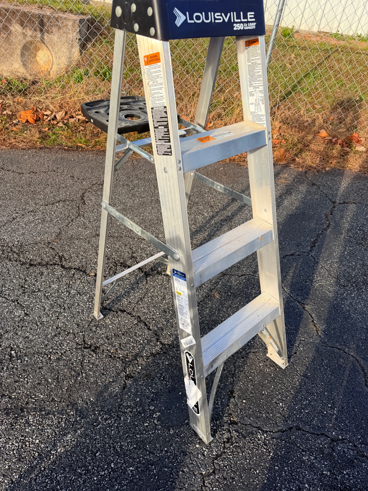 Ready to elevate your perspective? This Louisville 4-step ladder is here to lend you a hand (or four steps, to be precise!). It features a nifty top for holding your tools. Please review the photos carefully for a closer look at the details.