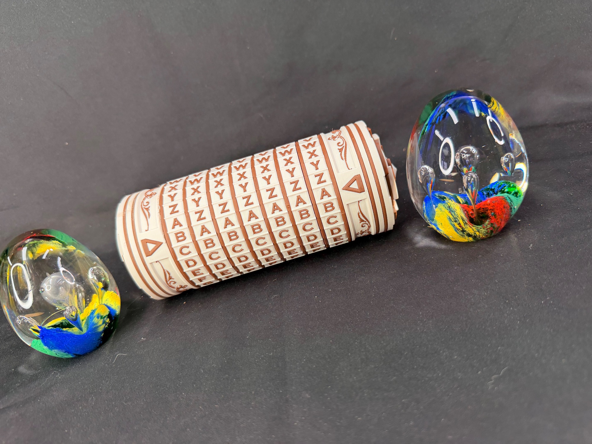 This fun seven tumbler lockable cylinder contains a hidden compartment to lock away your most favorite small treasures. This lot also includes two Murano glass, rainbow bubble art paperweights.