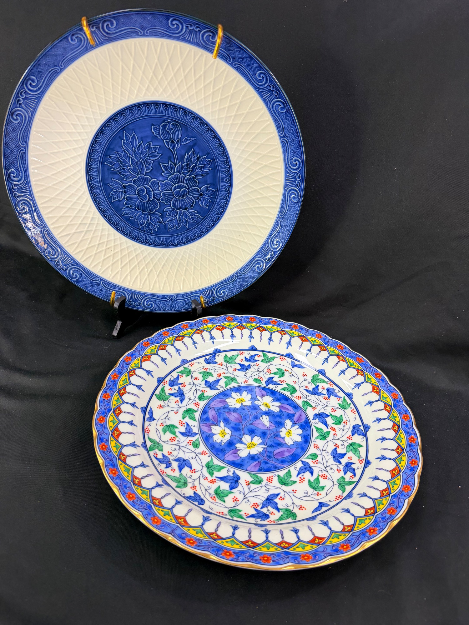 This lot includes two stunning Japanese display plates. One has vintage, TOYO porcelain, blue and white, serving platter and the other is a Japanese Imari style colorful designed platter.